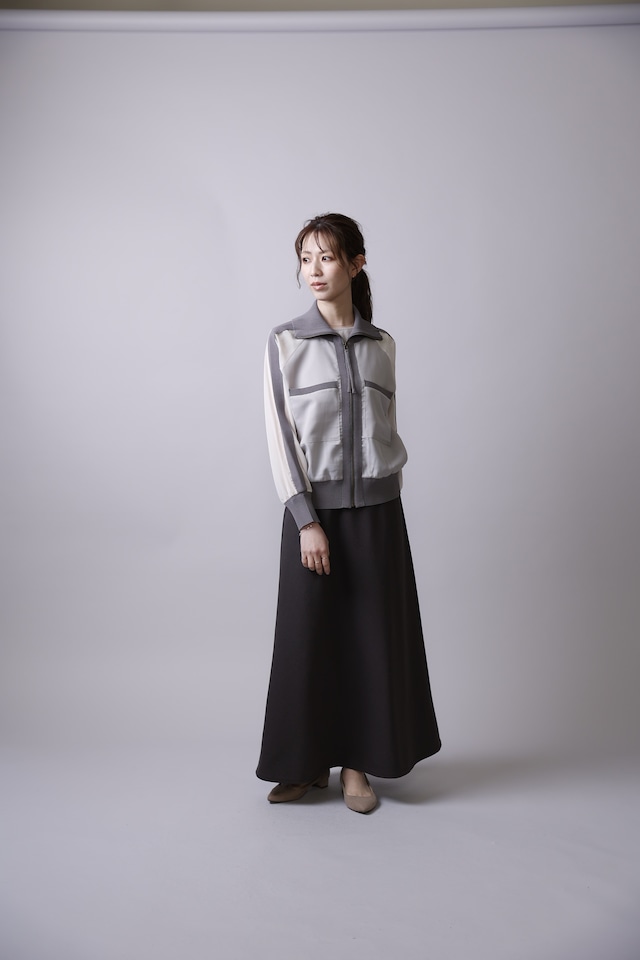 コットン×ポリエステルのブルゾンは ガーゼのような柔らかな手触りのブルゾン。ナイロン×ポリエステル素材との異素材コンビのデザインは 柔らかなコットンブルゾンを 立体的な独特のフォルムにしています。袖口と裾に入ったゴムで 更にふんわり春らしい1枚。ドロップショルダーで 脇も締め付けない、ゆったりとした袖付けなので暑い夏には日除けとしても活躍しそうな心良いブルゾンです。