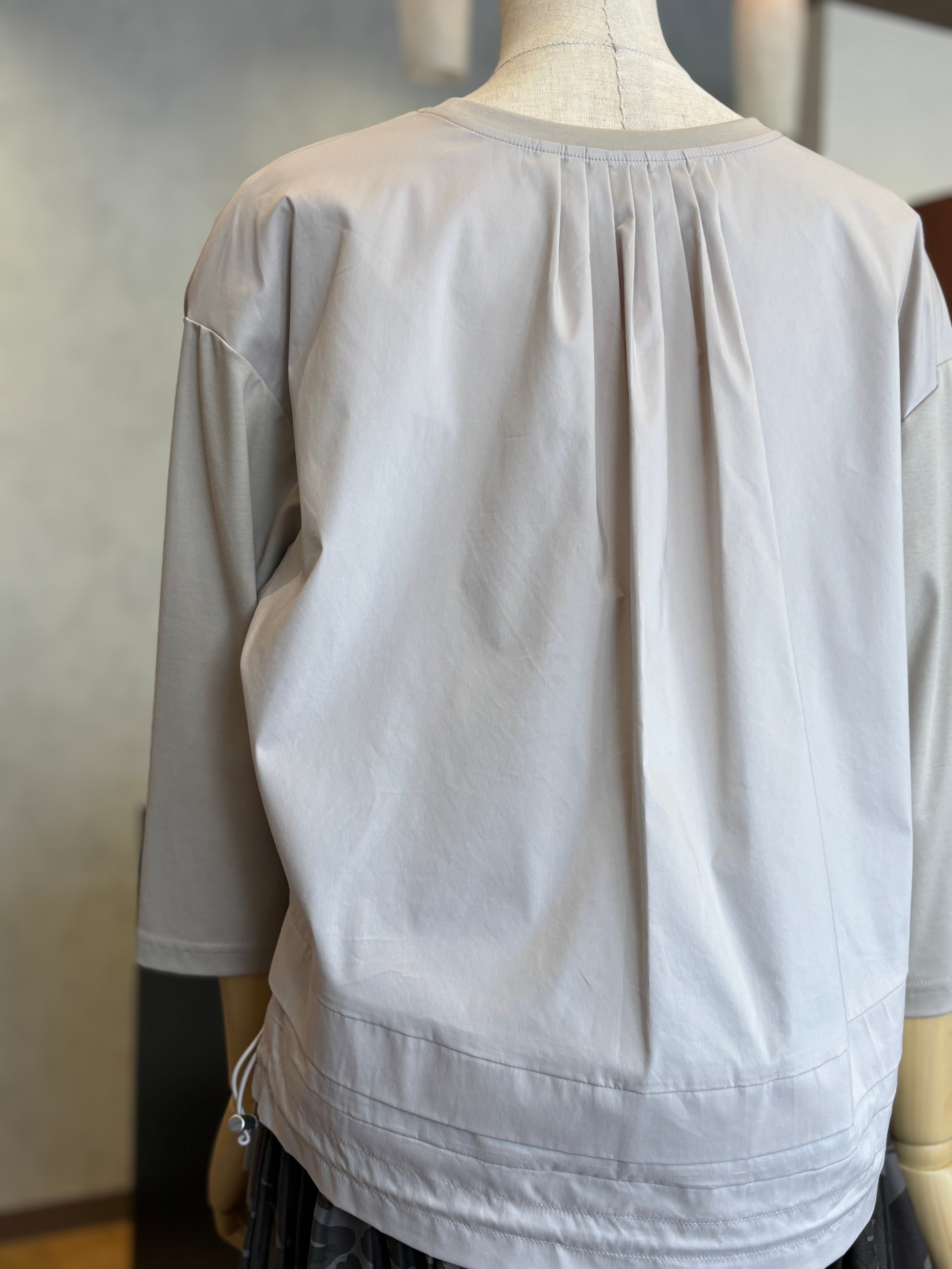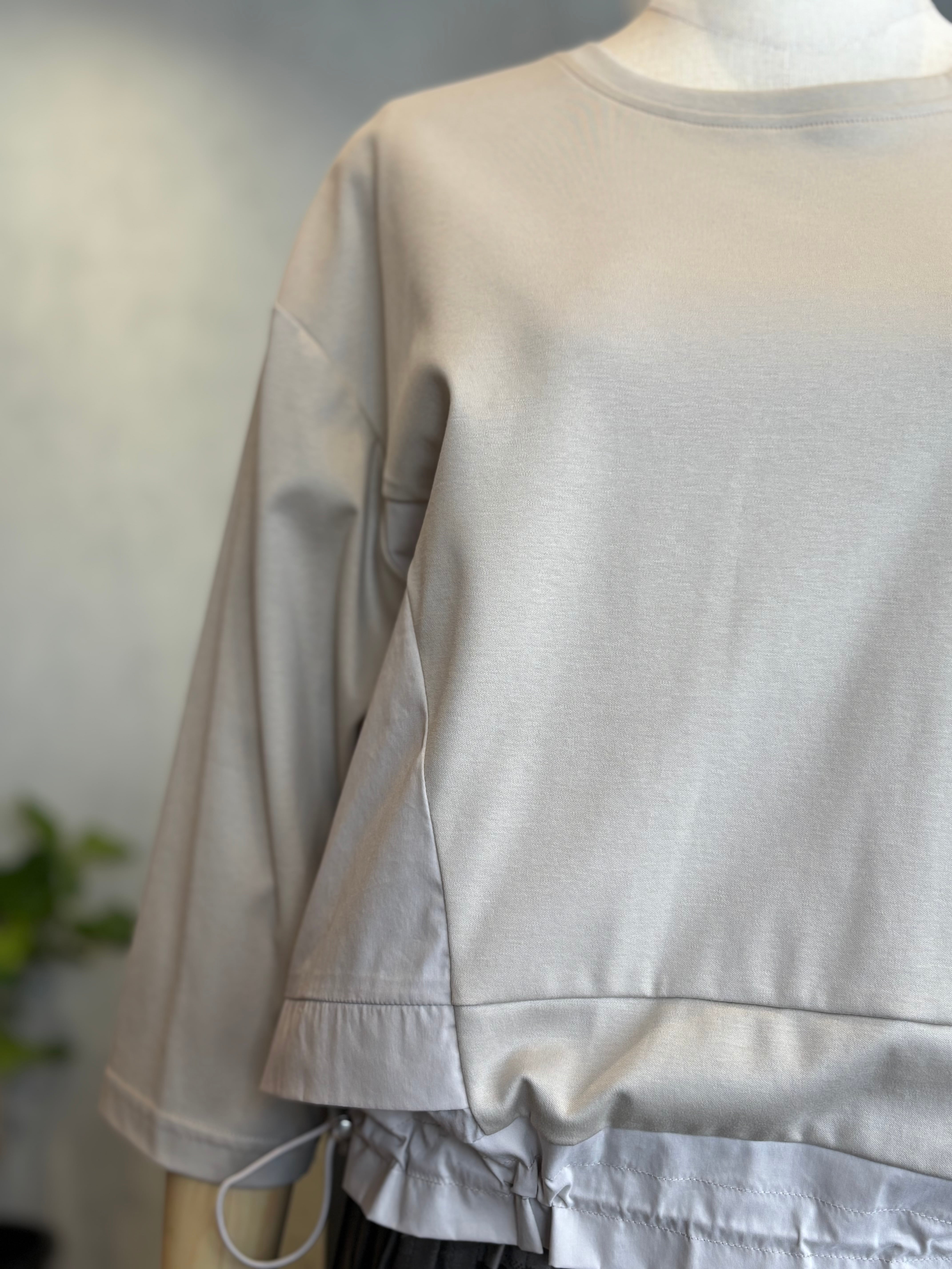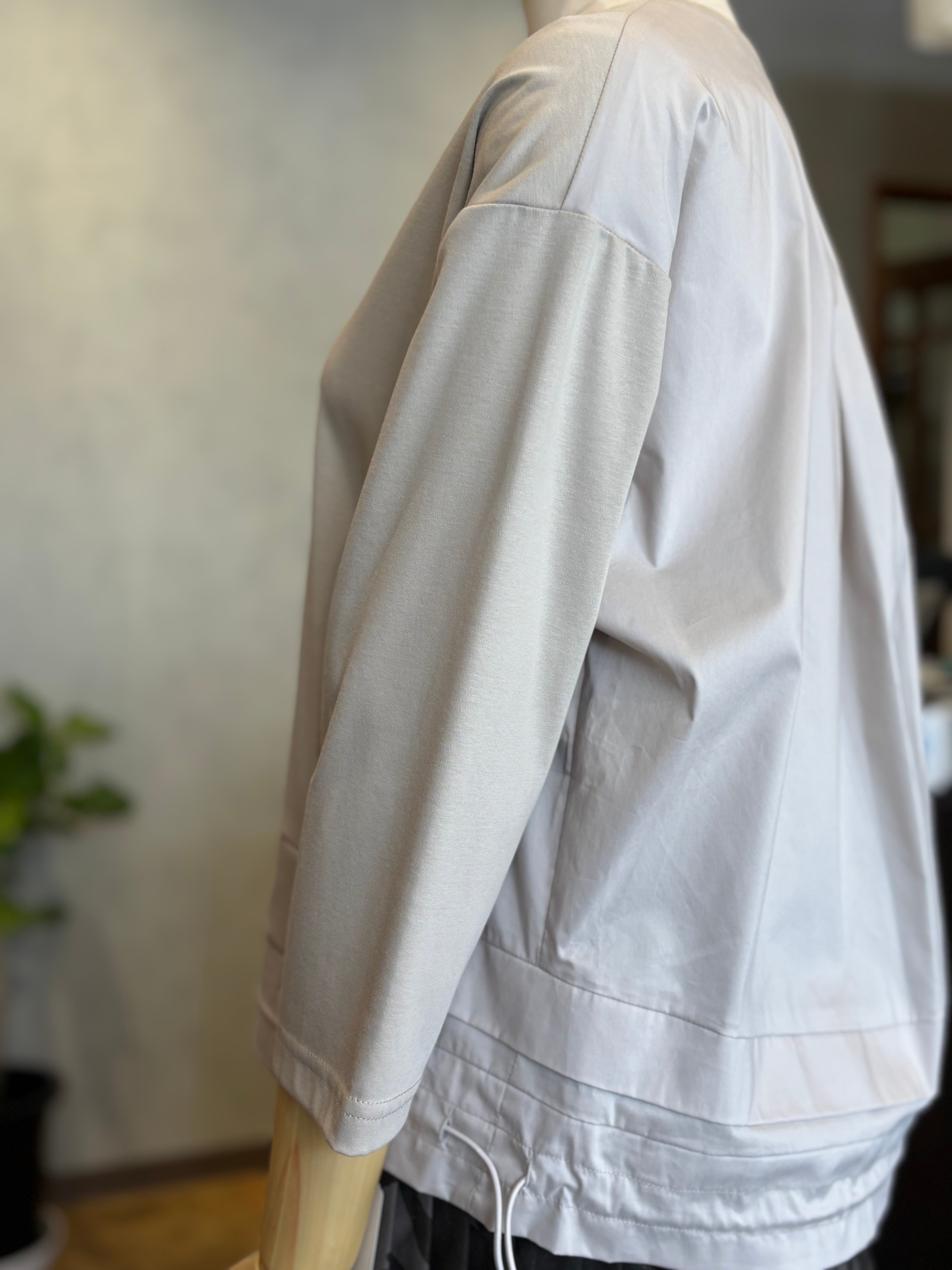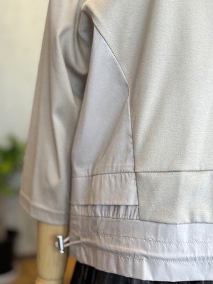 切り替えのある 裾には ドローコードが施されていて シルエットを自由に変化させることが可能です。カジュアルにゆったり着ても 絞ってコンパクトにまとめても◎。