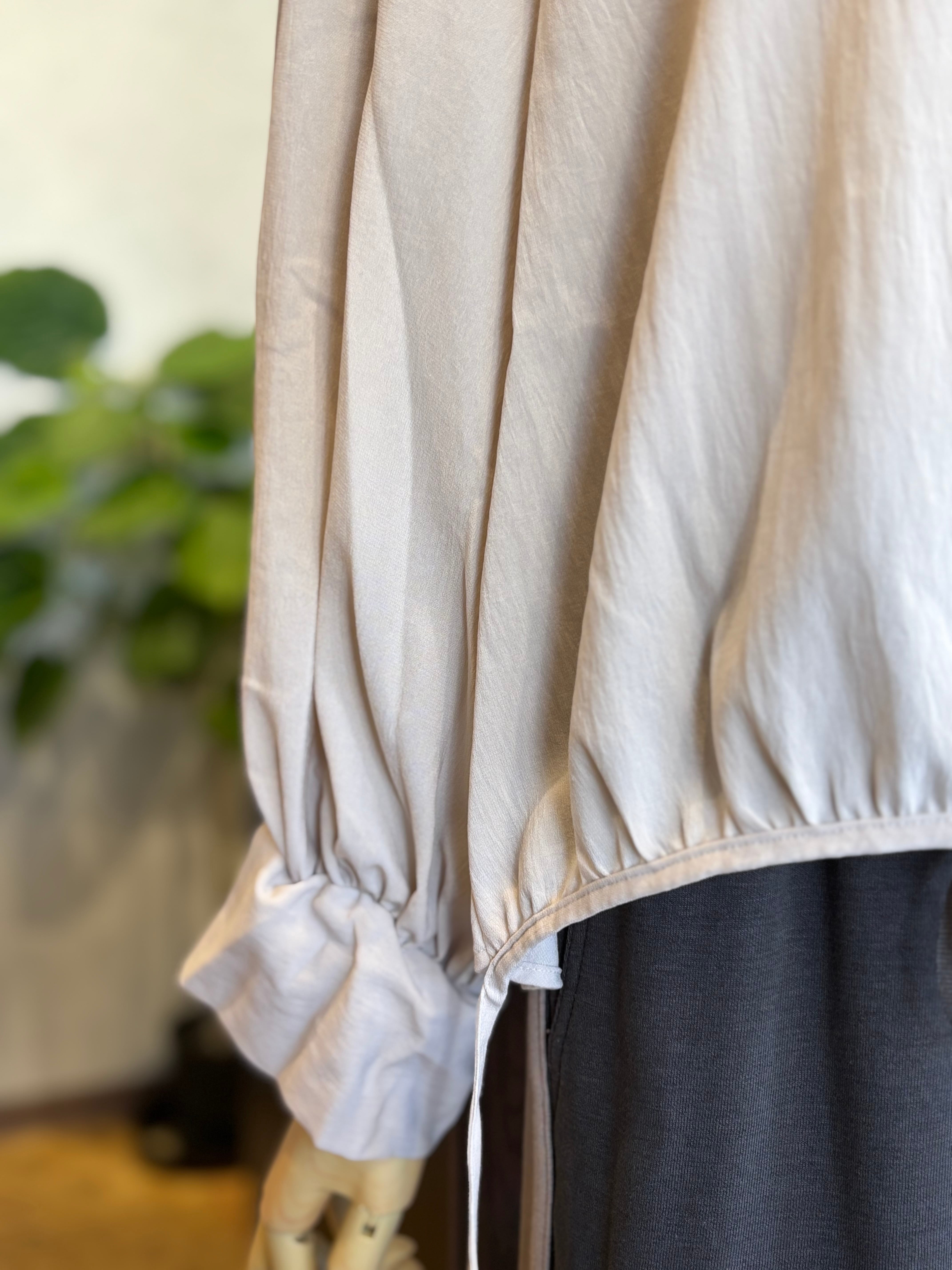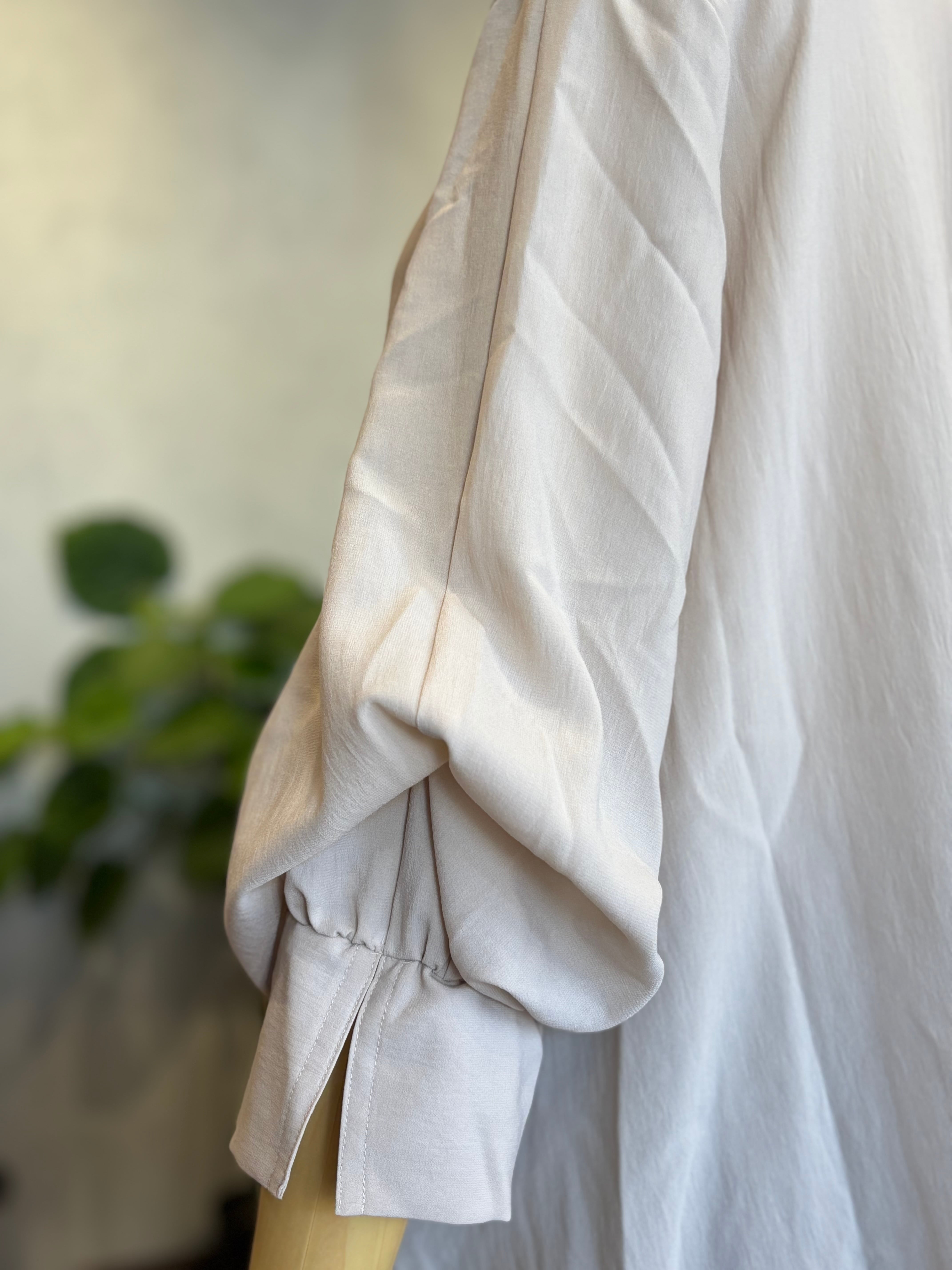 袖の内側にはボタンを備え、袖丈を変えてアレンジできる2WAY仕様。七分袖風にもロングスリーブにも変化でき、季節やシーンに合わせて着回しが楽しめます。