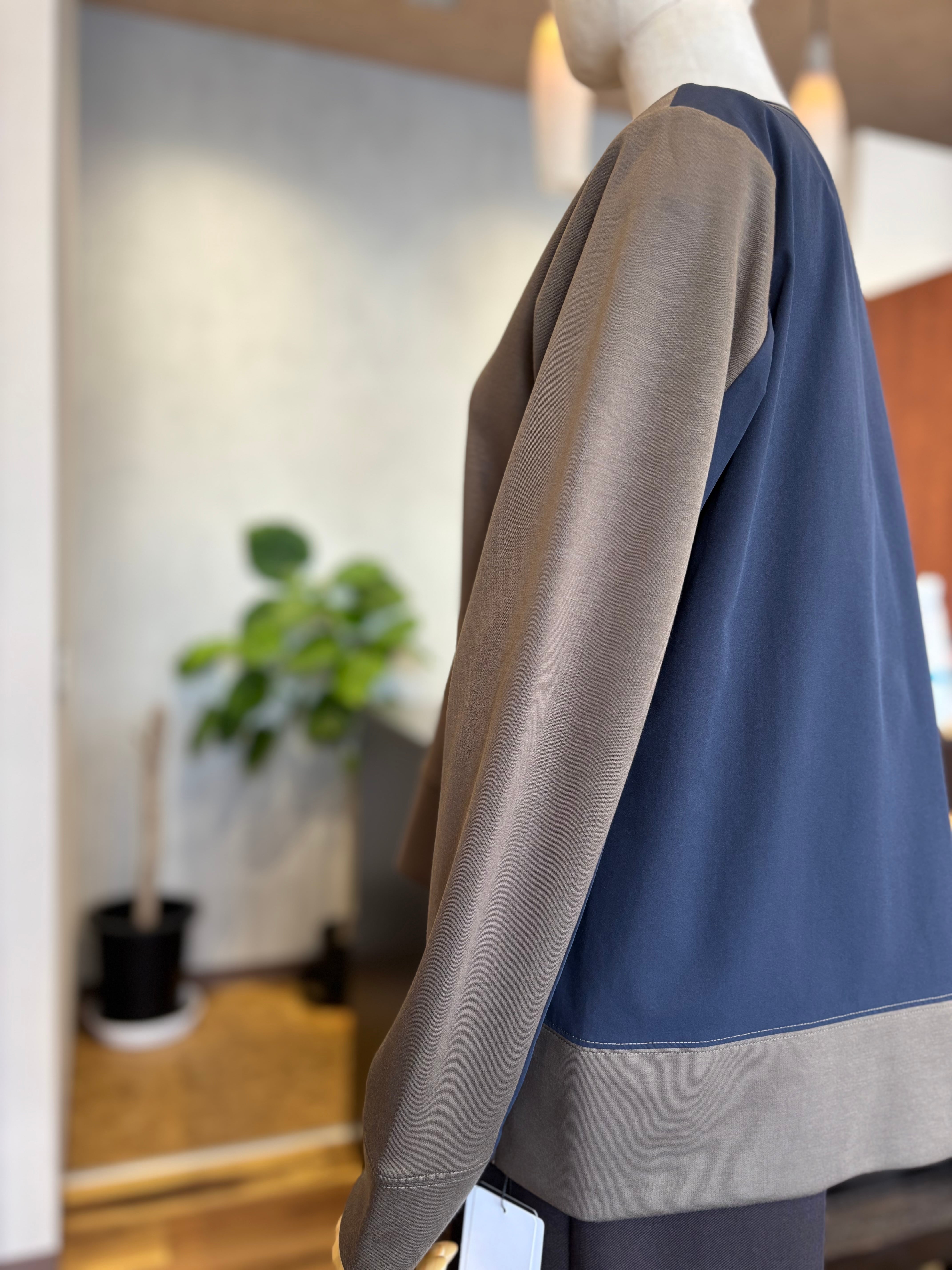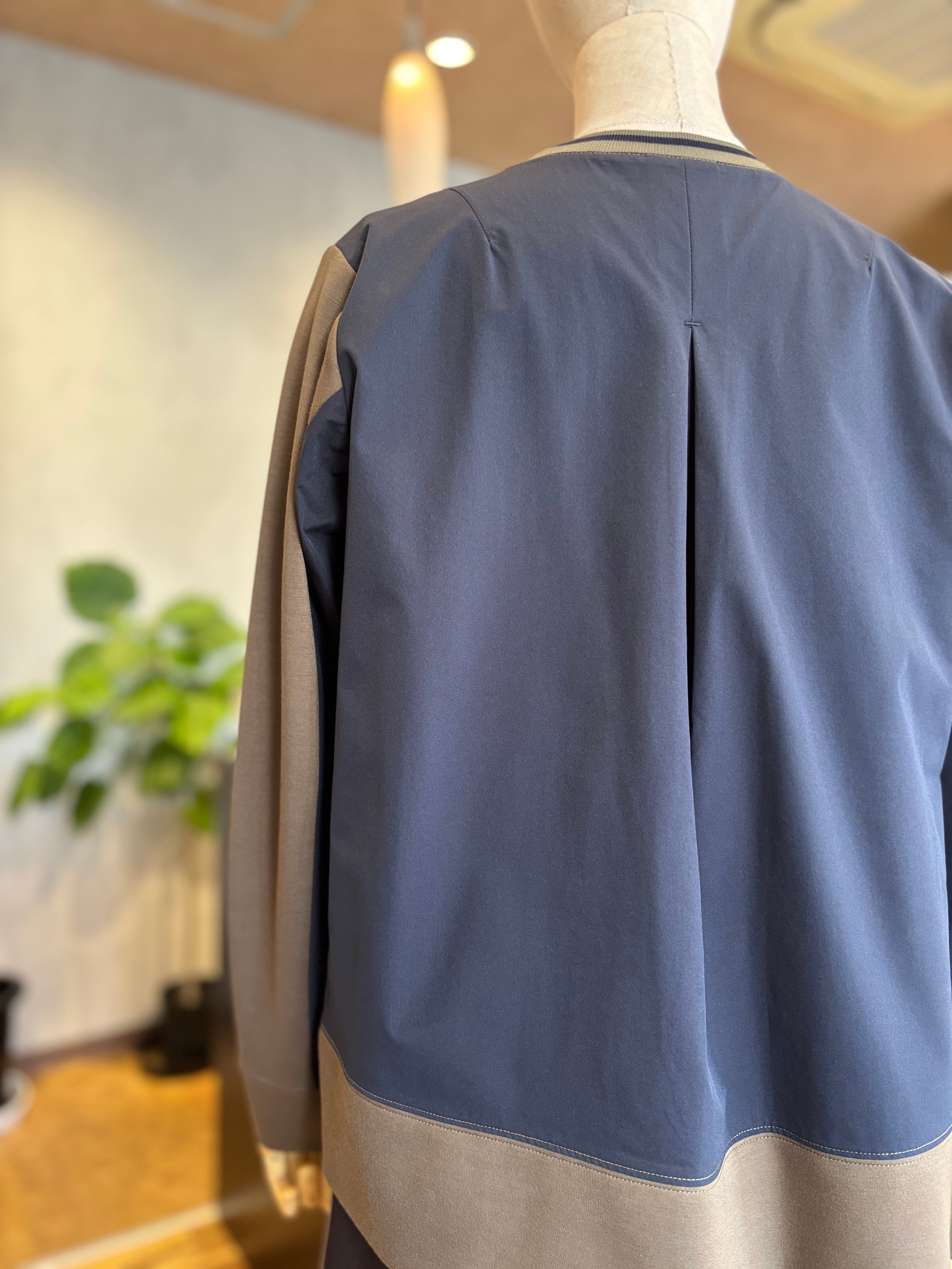 サイドから背中、袖にも異素材を使い、切り替えることで、シンプルながらも立体感のある表情に仕上げました。