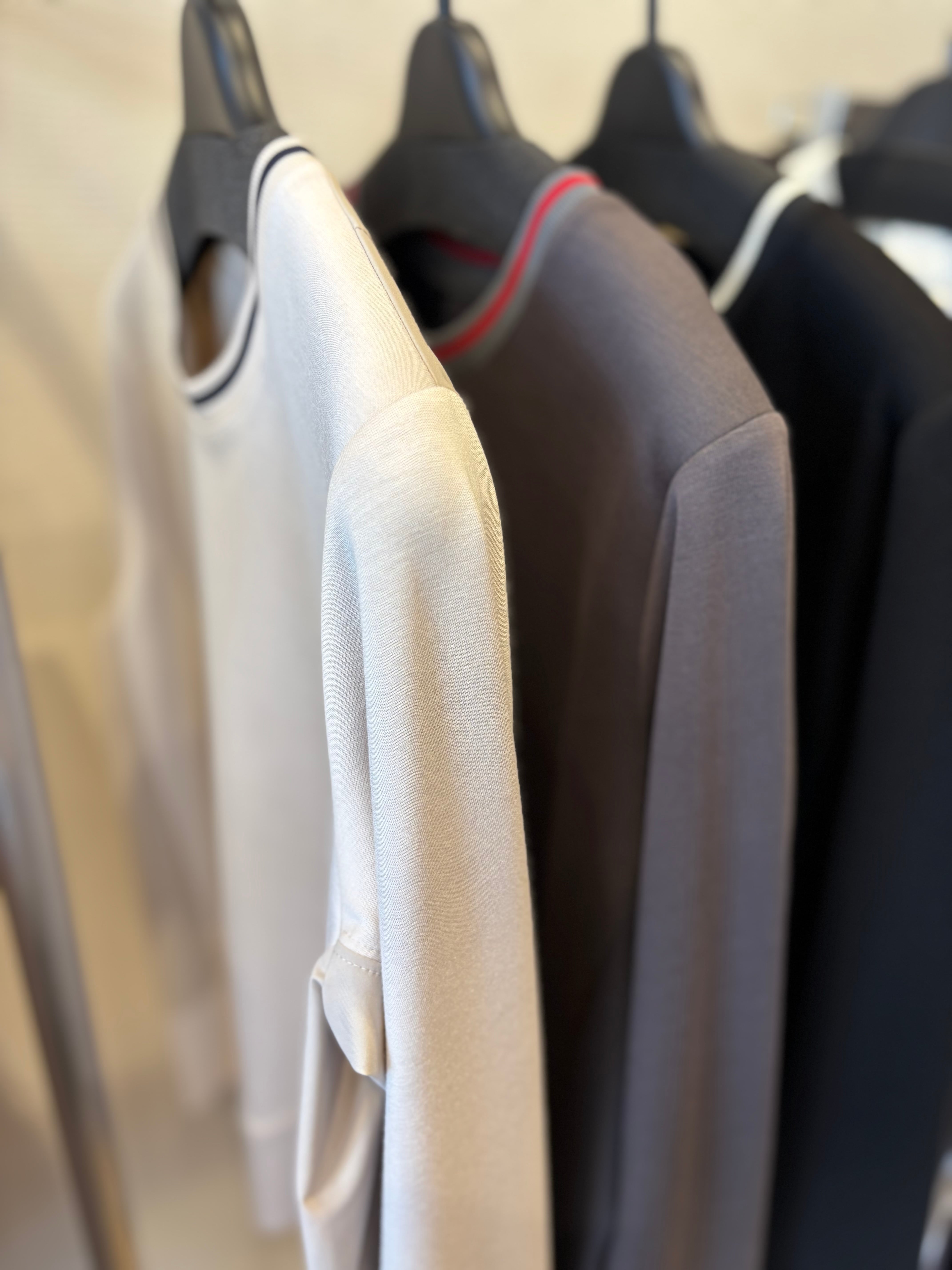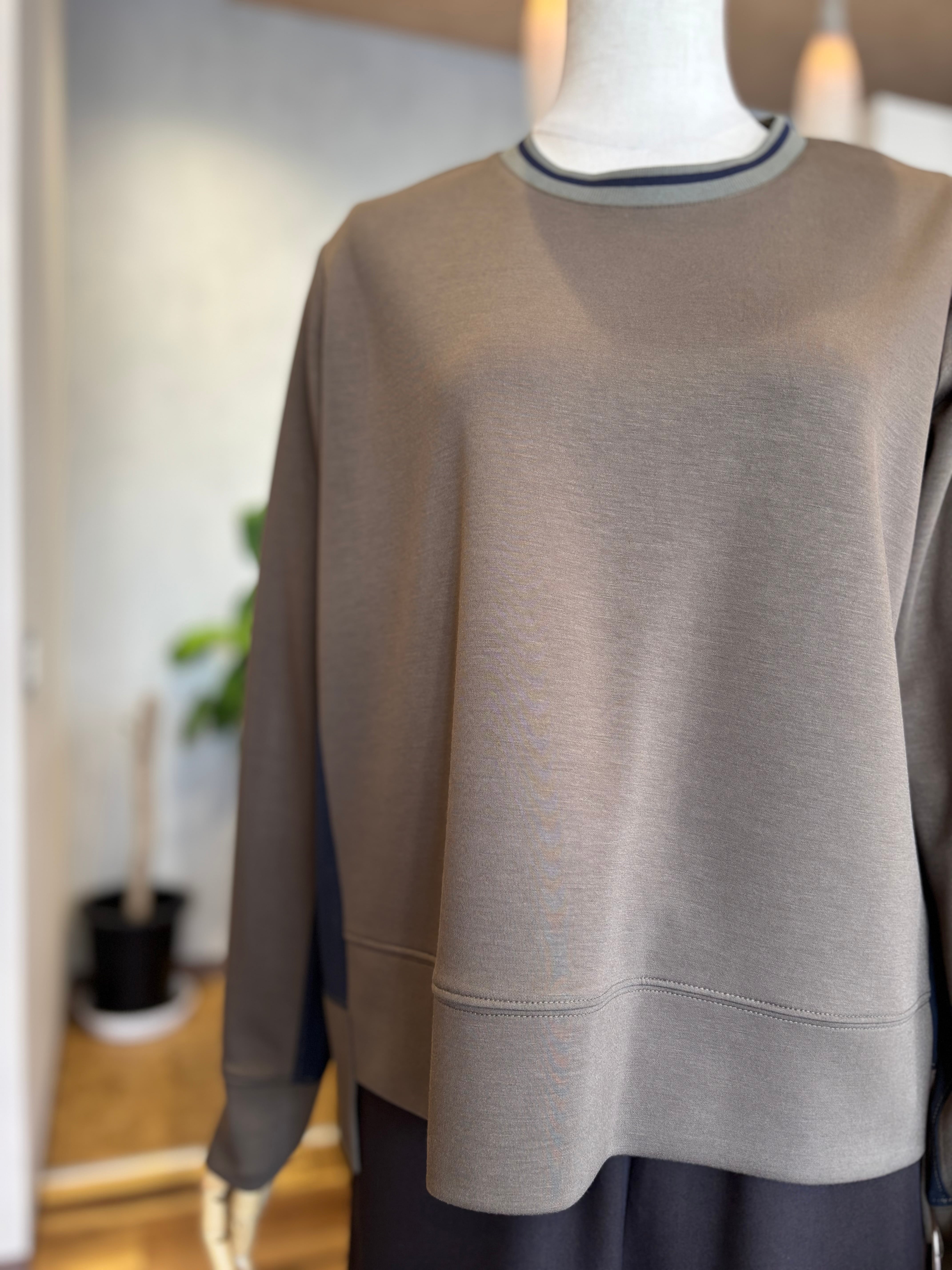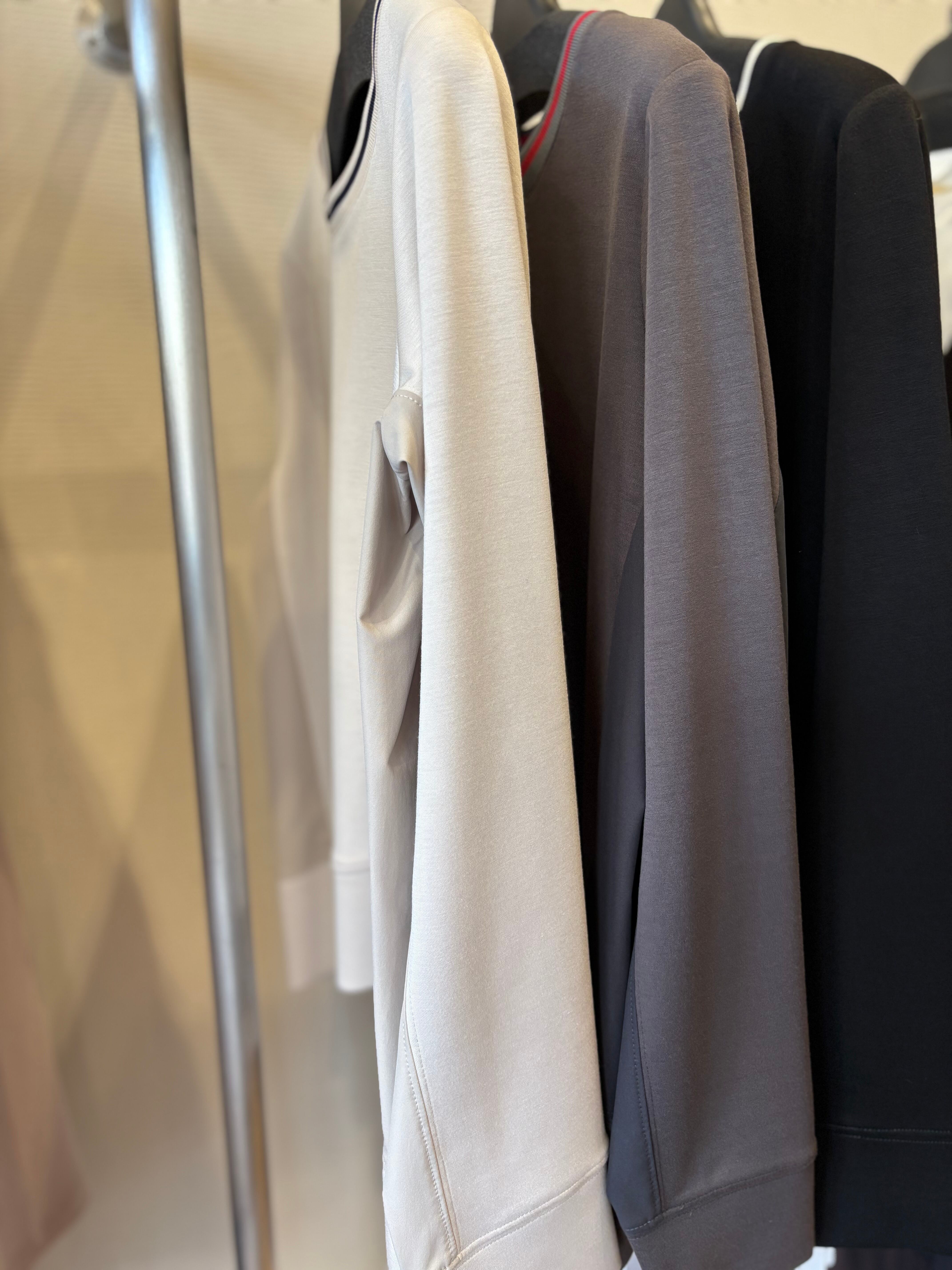 上品な光沢感のあるストレッチ素材を使用した、大人のためのプルオーバー。