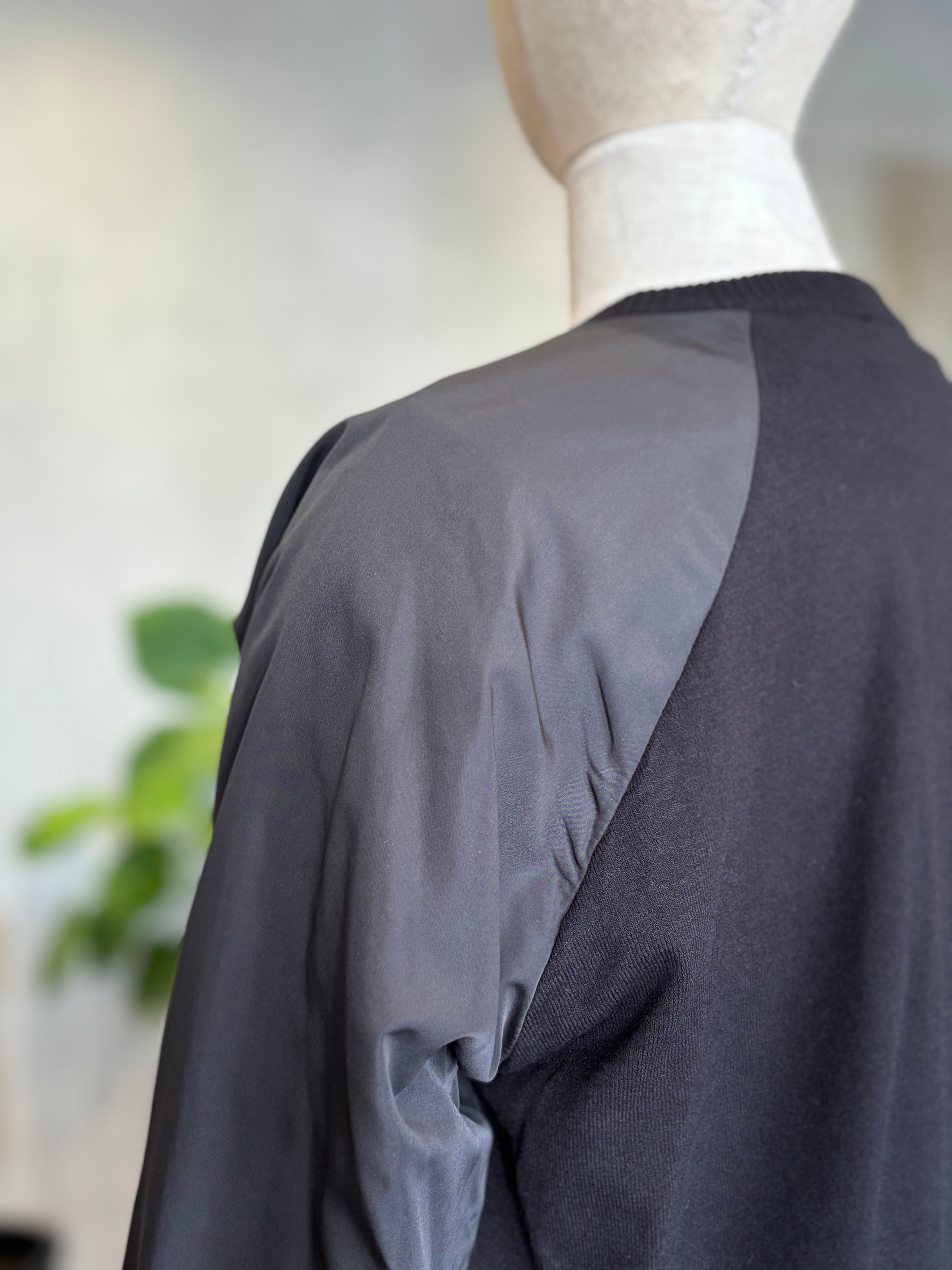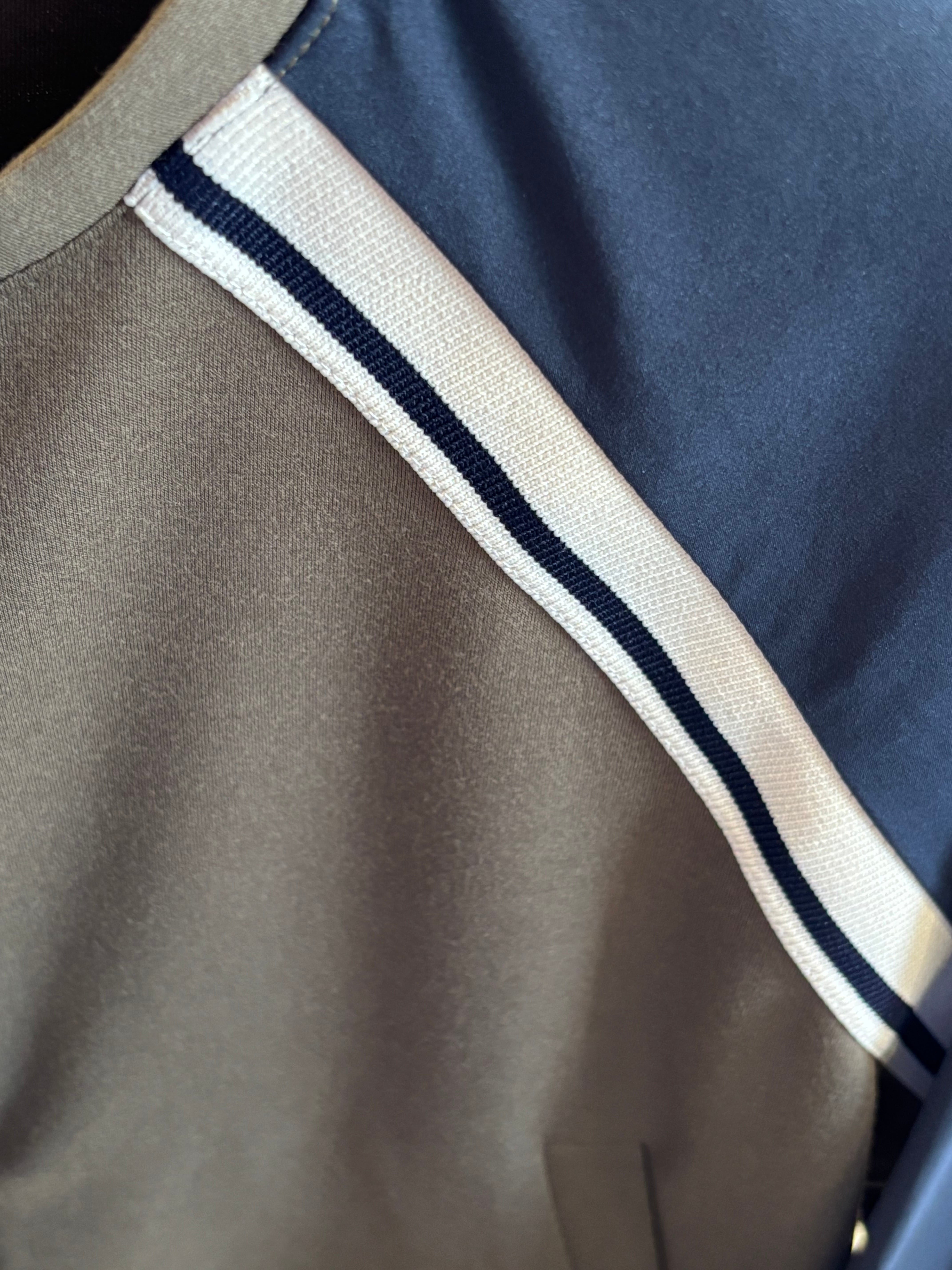 ラグランの袖の切り替えにラインのニットテープを使い、シンプルながらも大人のスポーツテイストに仕上げました。