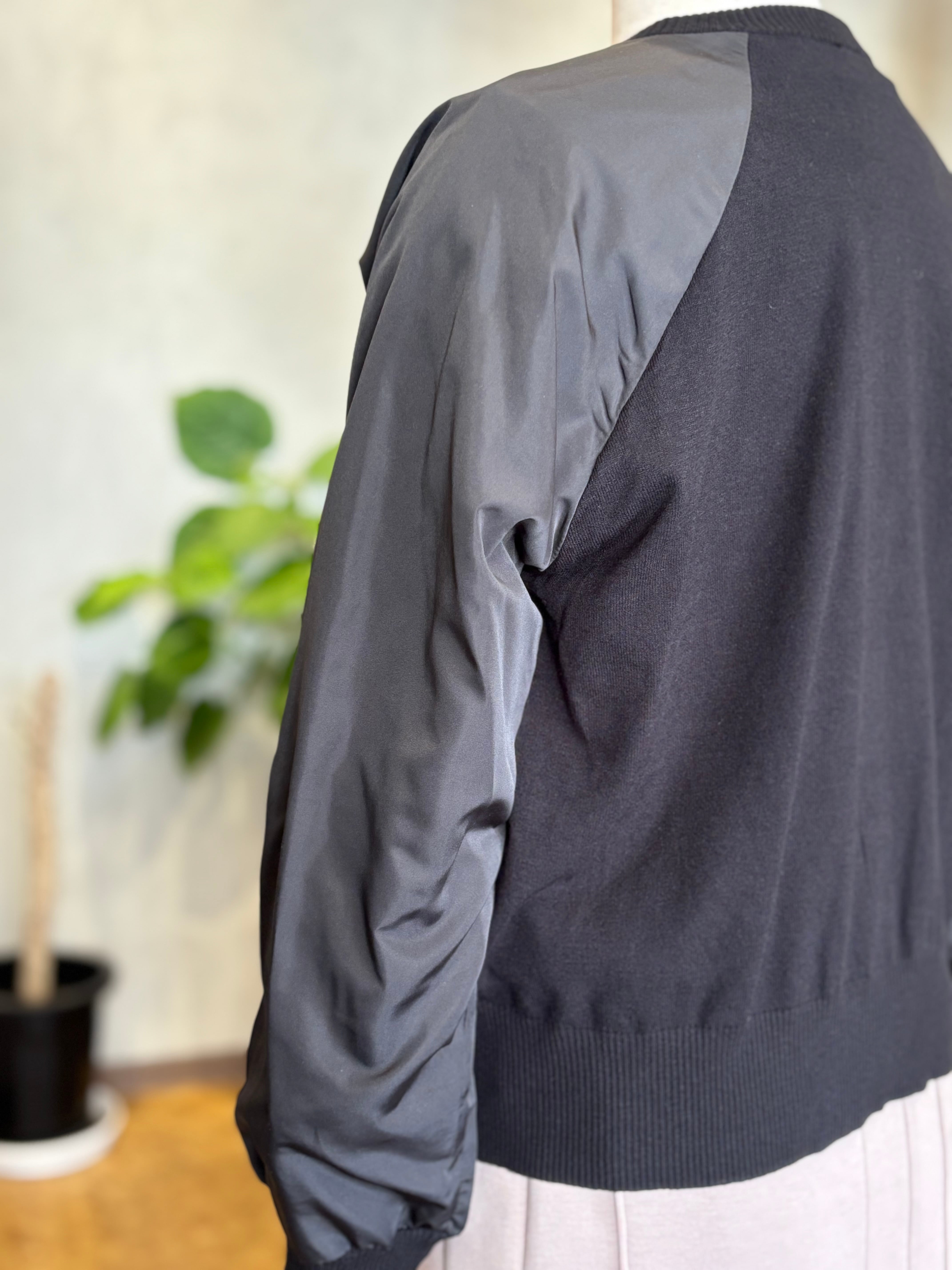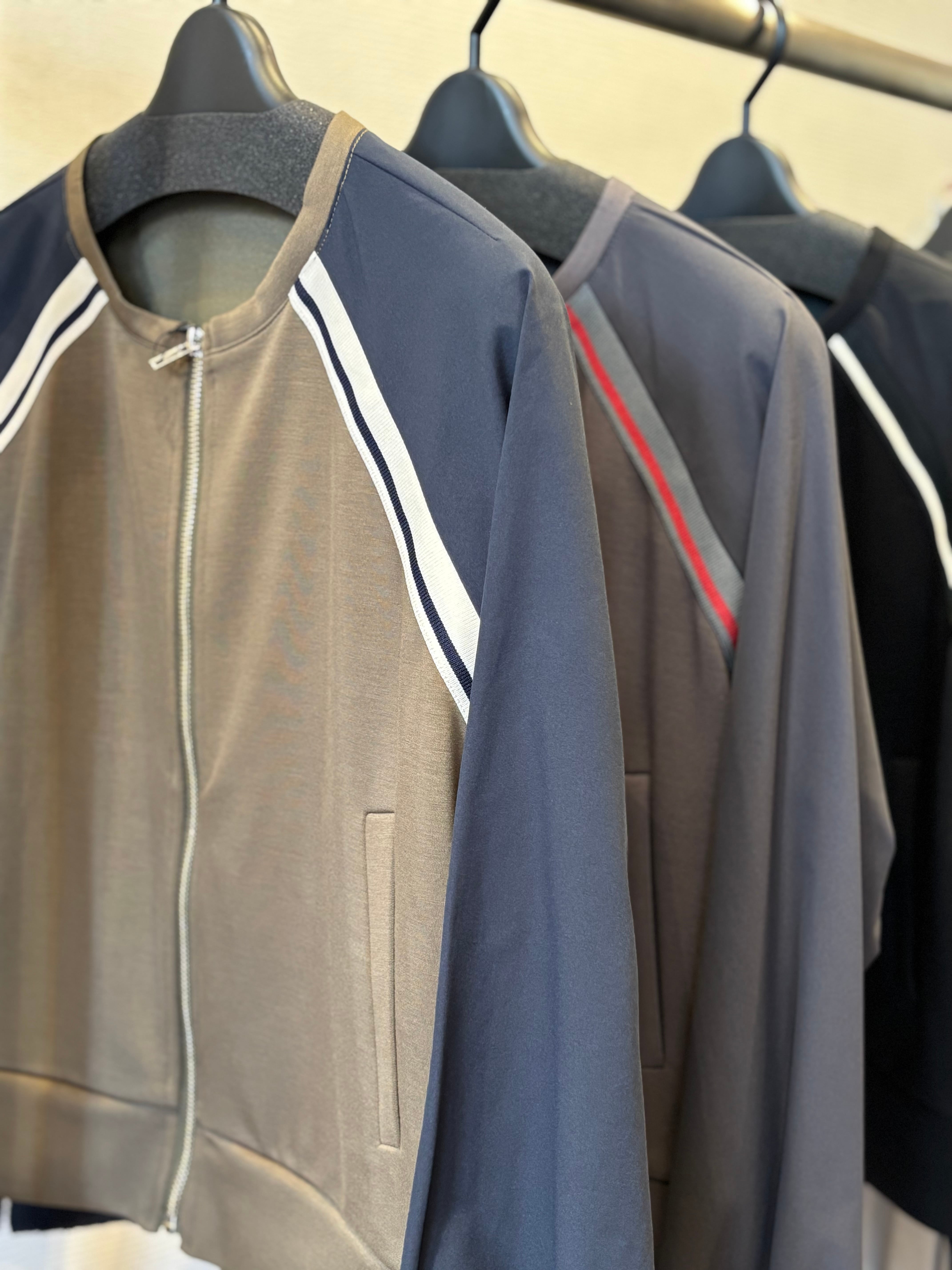 上品な光沢感のあるストレッチ素材に 軽いポリエステルの袖を使用した、大人のためのジップブルゾン。