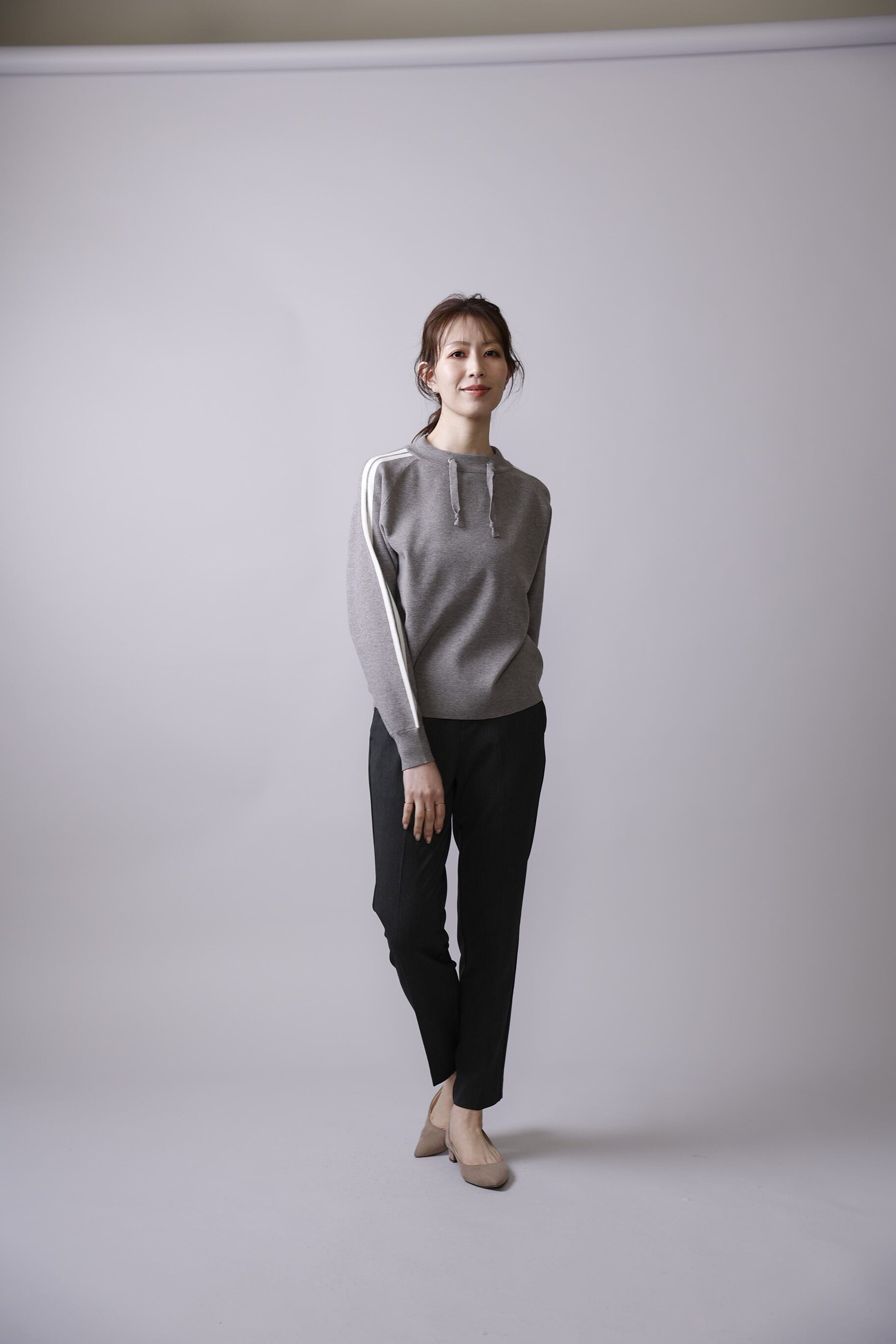 肩から袖にかけて入ったラインデザインがさりげなくスポーティーなアクセントになり、シンプルながらも印象的なスタイリングを叶えます。