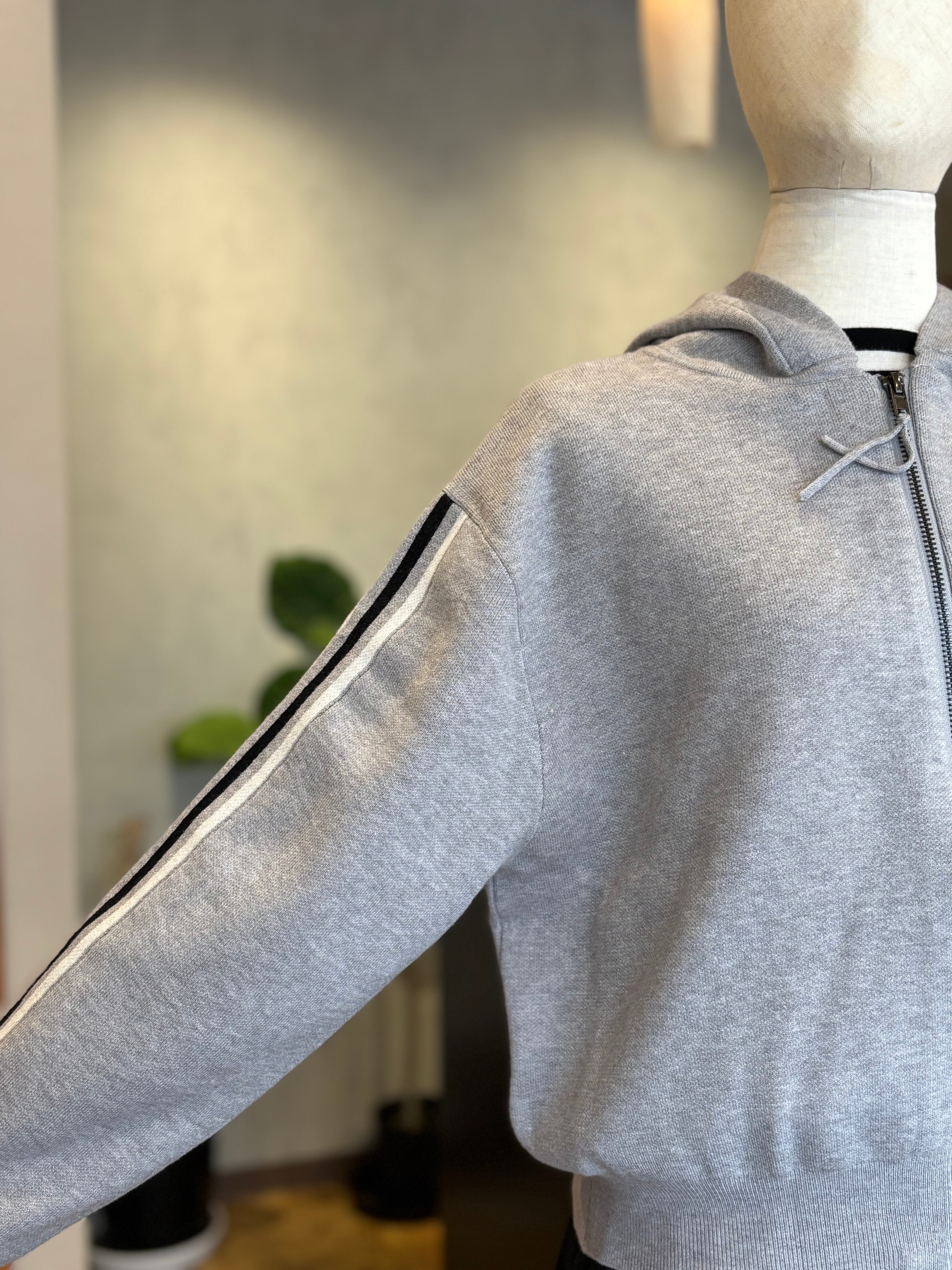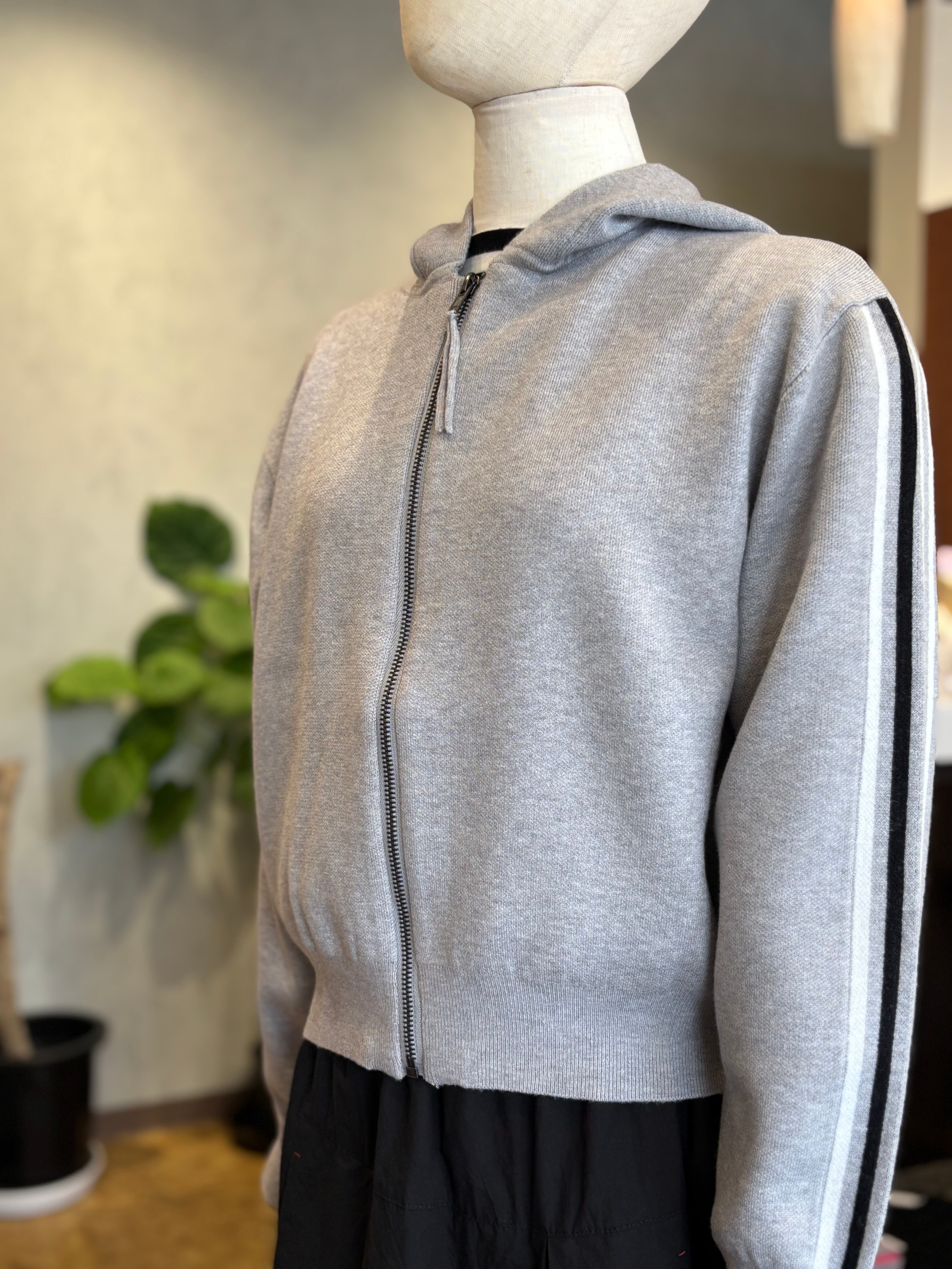 袖に入ったラインデザインがスポーティなアクセントを添えつつ、シンプルなシルエットで大人の上品さを演出します。やわらかな肌触りと軽さで、シーズンを通して快適に羽織れる一枚です。カジュアルにもフェミニンにも合わせやすい万能アイテム。