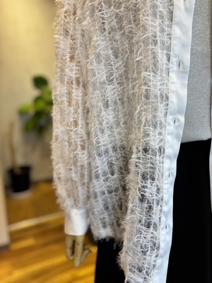ほんのりと肌を感じさせるシアーな素材に、表情豊かな生地感を組み合わせ、上品さと華やかさを演出します。軽やかな着心地で、女性らしい抜け感を楽しめる一枚です。