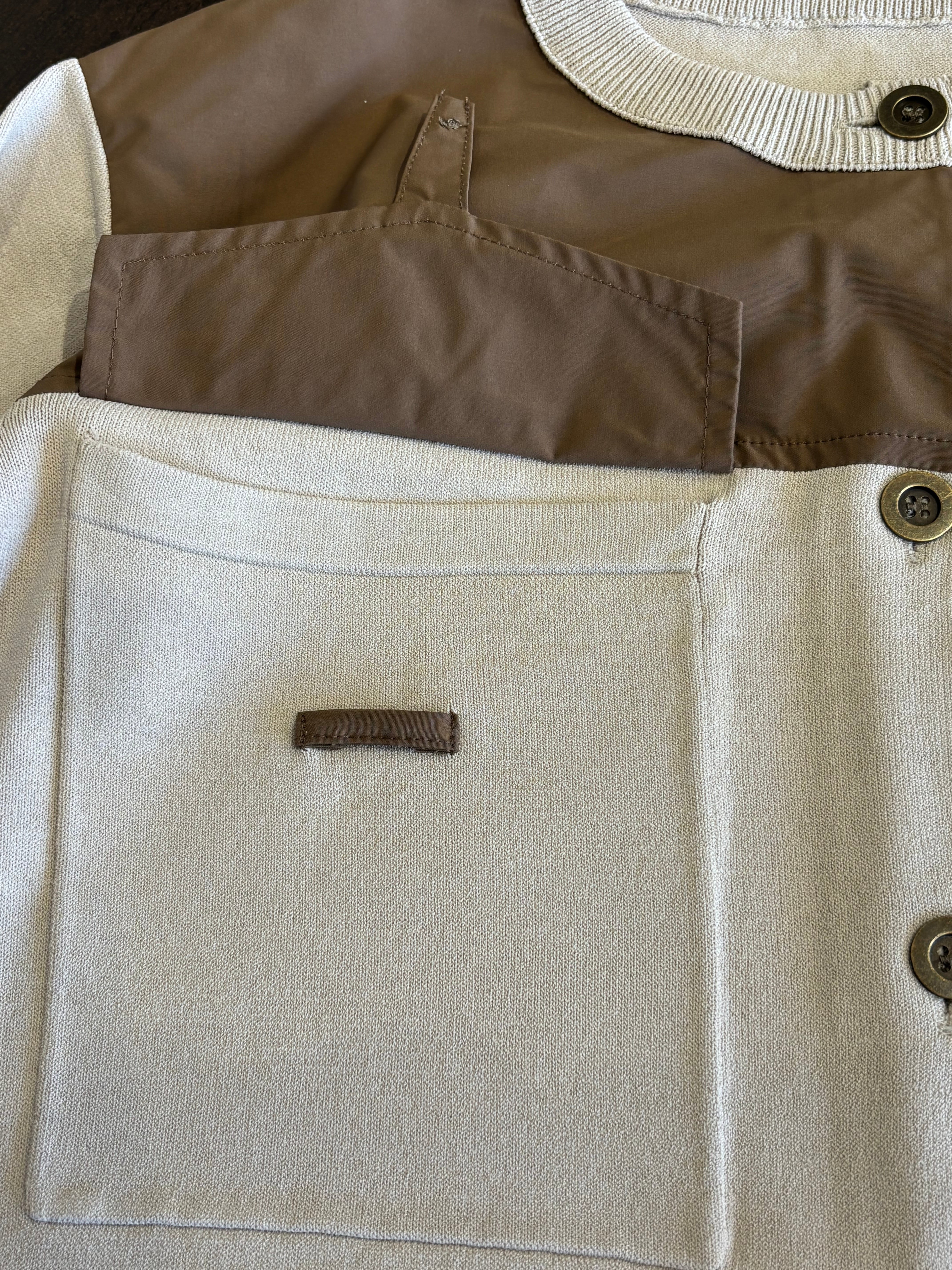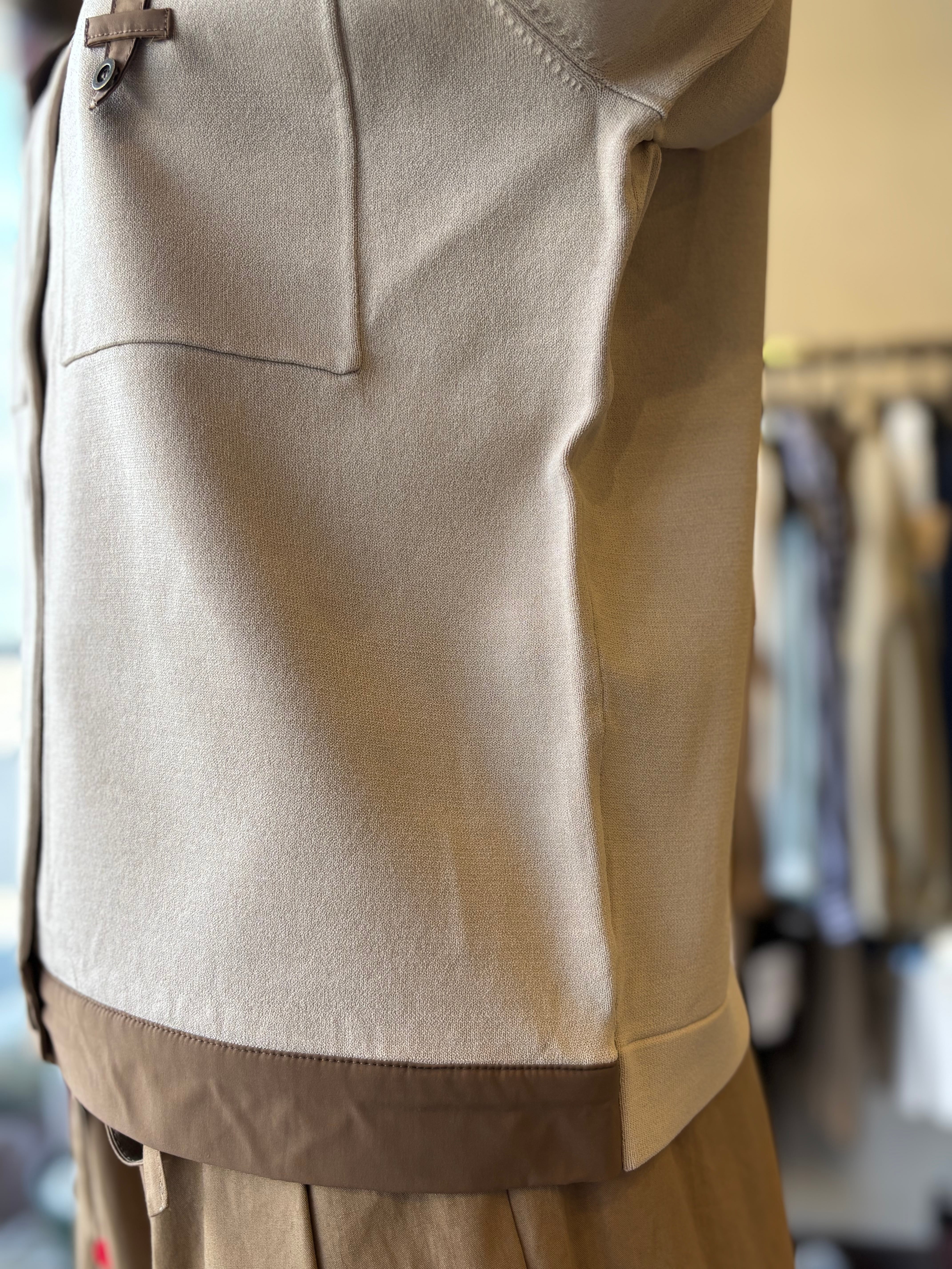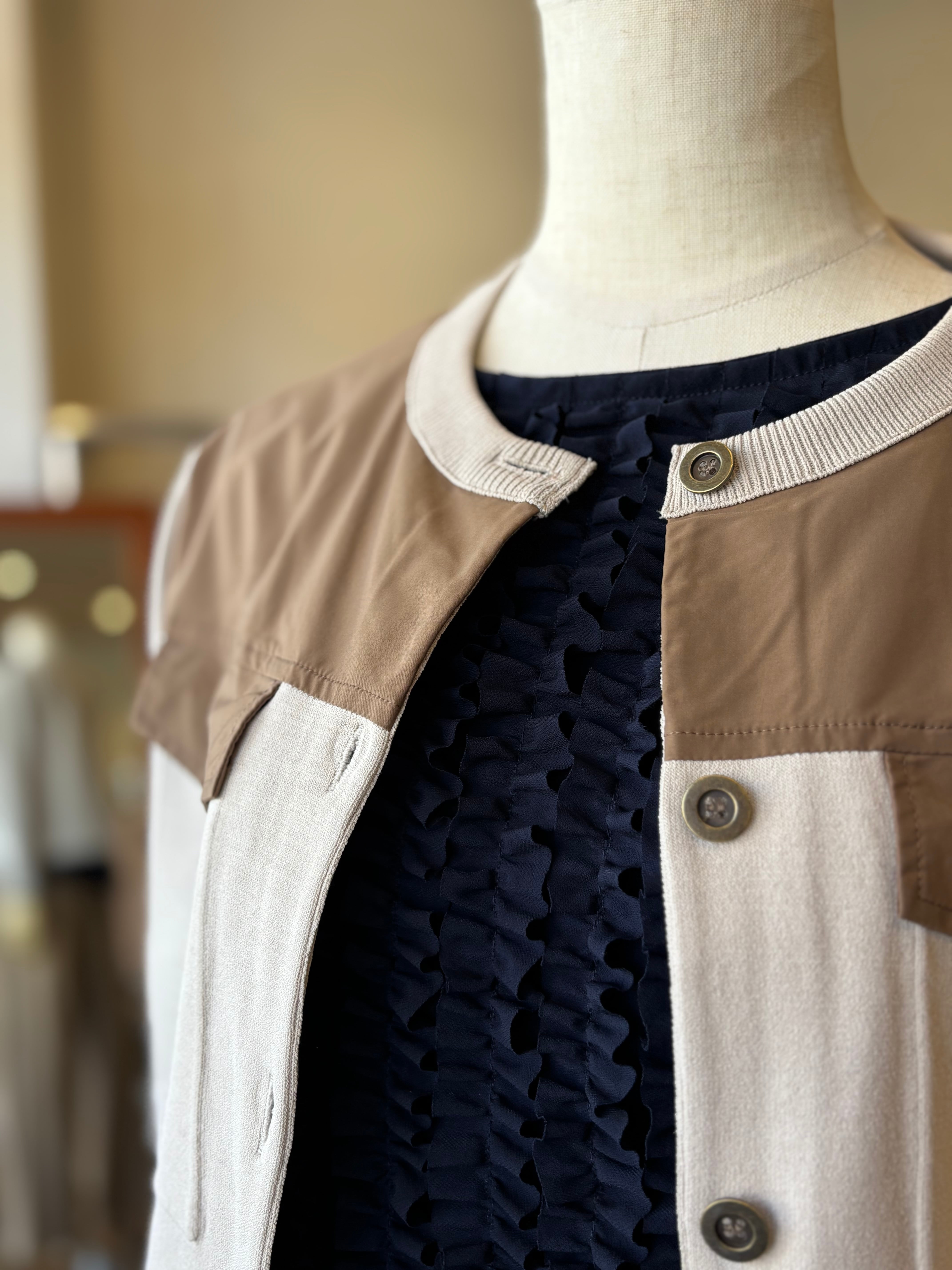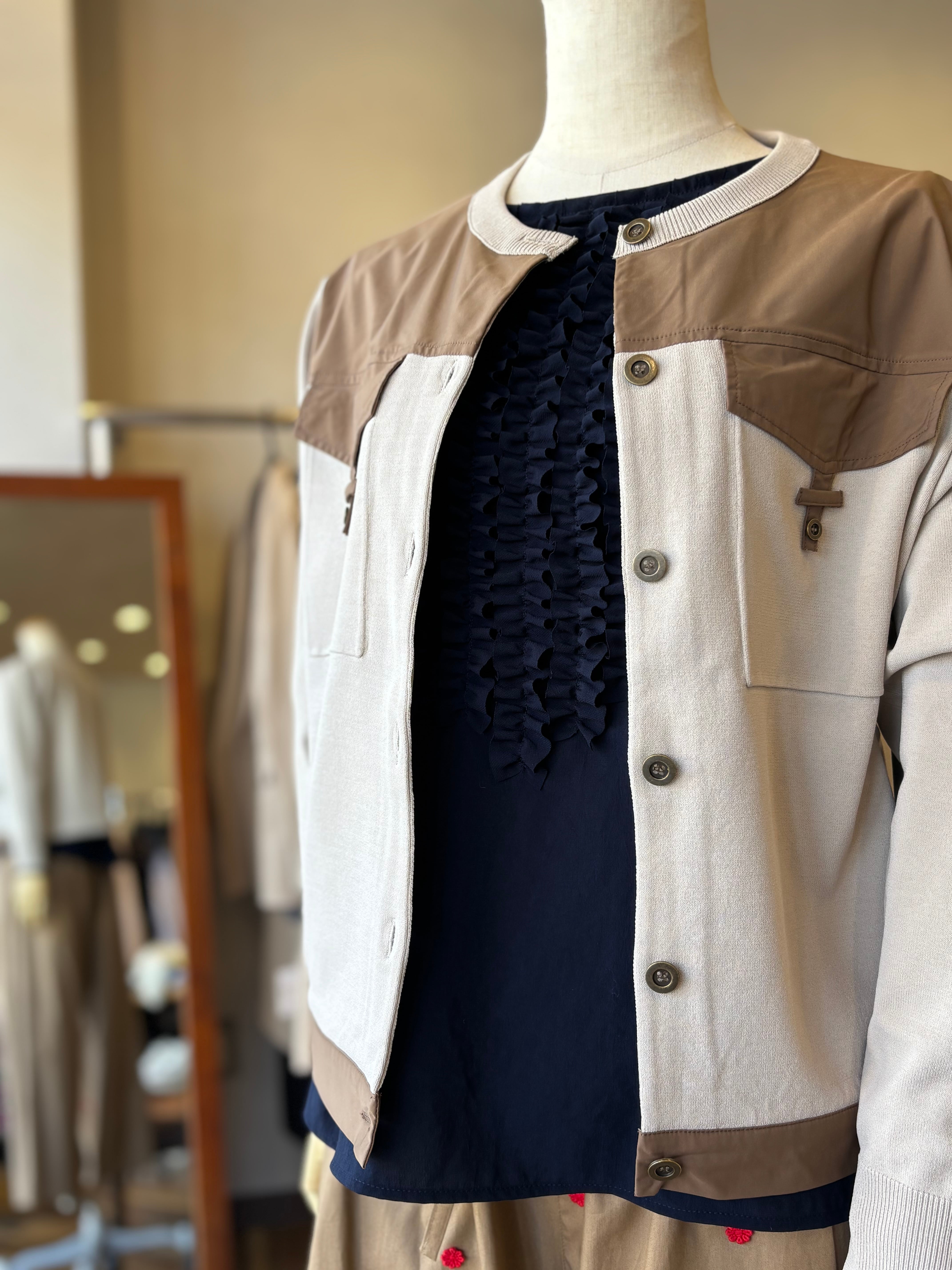 布帛部分が全体を引き締め、羽織るだけでコーディネートに立体感と上品さをプラスします。