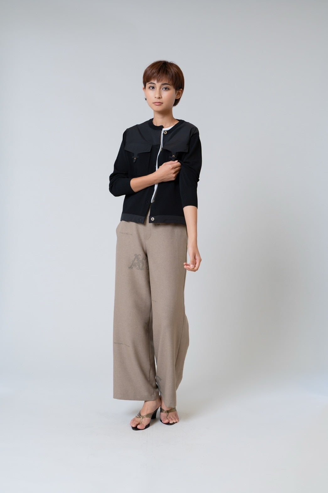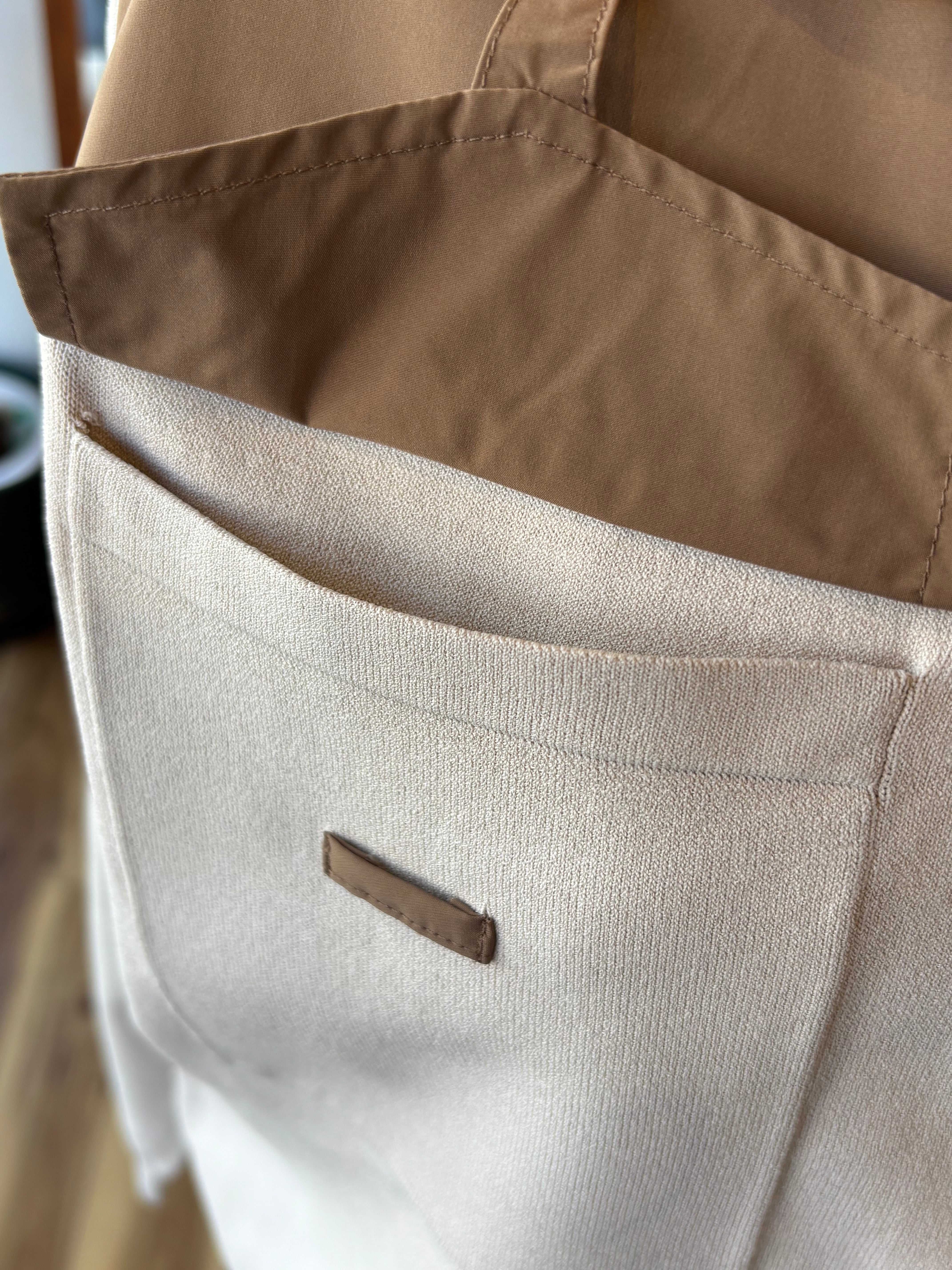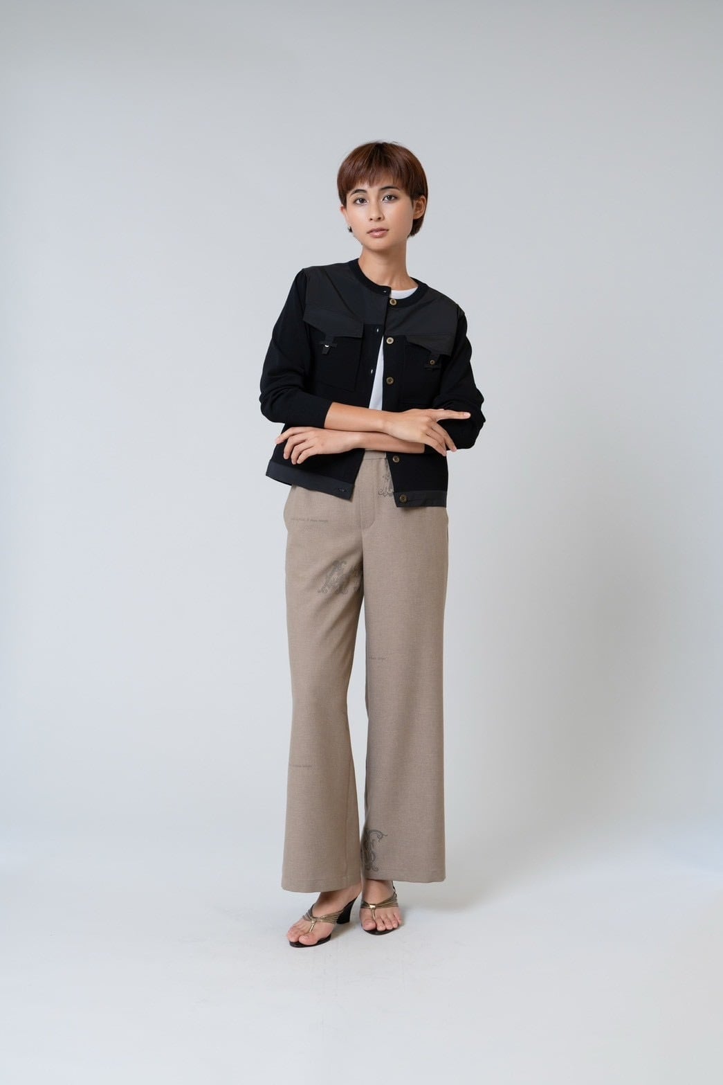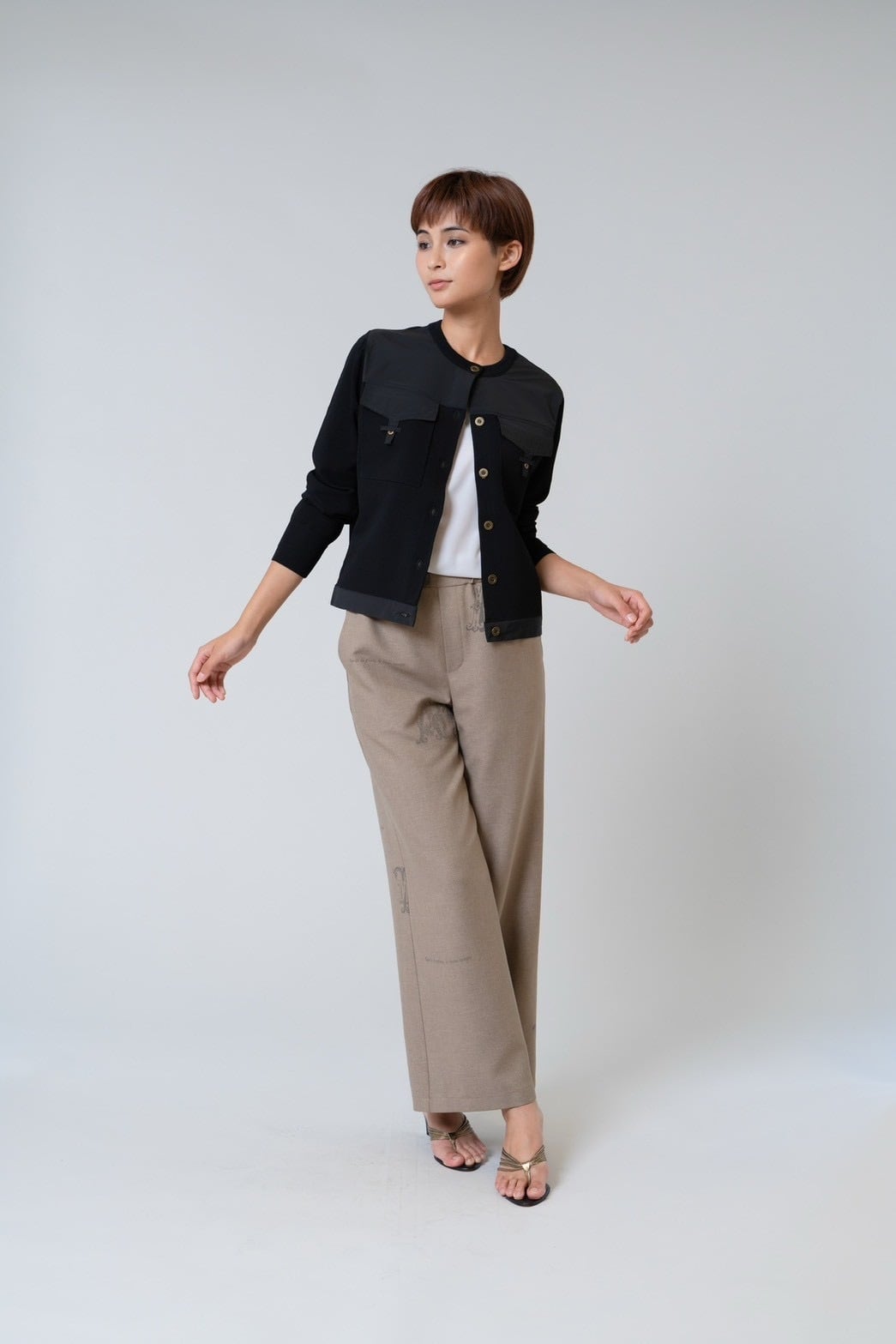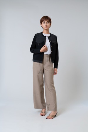 布帛部分が全体を引き締め、羽織るだけでコーディネートに立体感と上品さをプラスします。