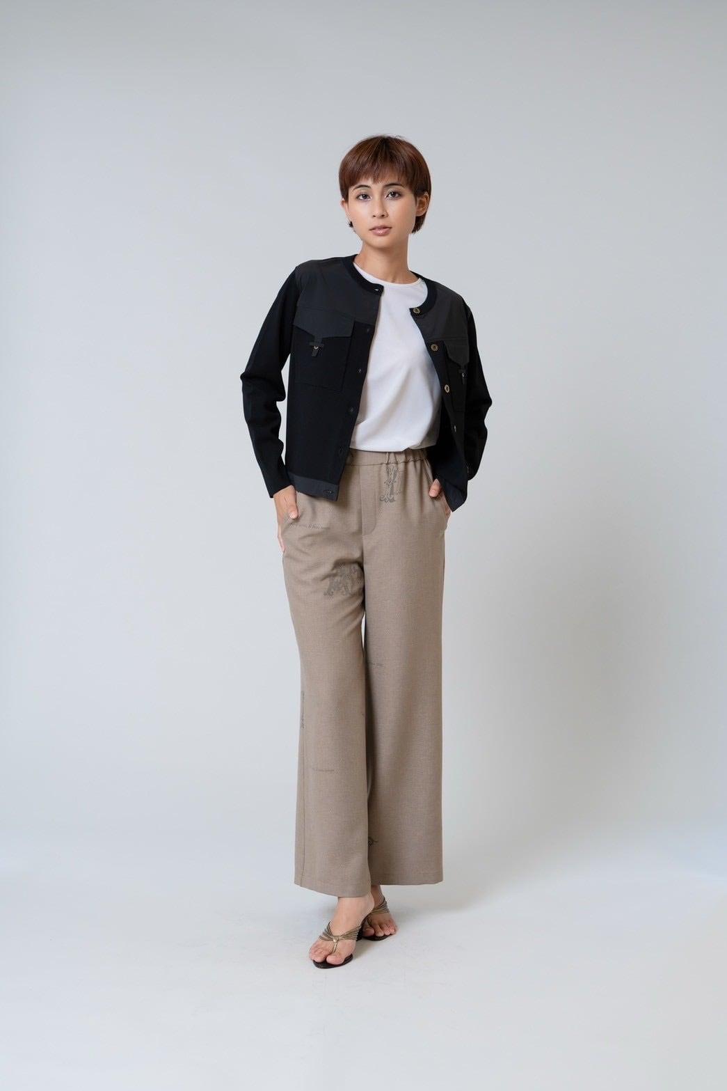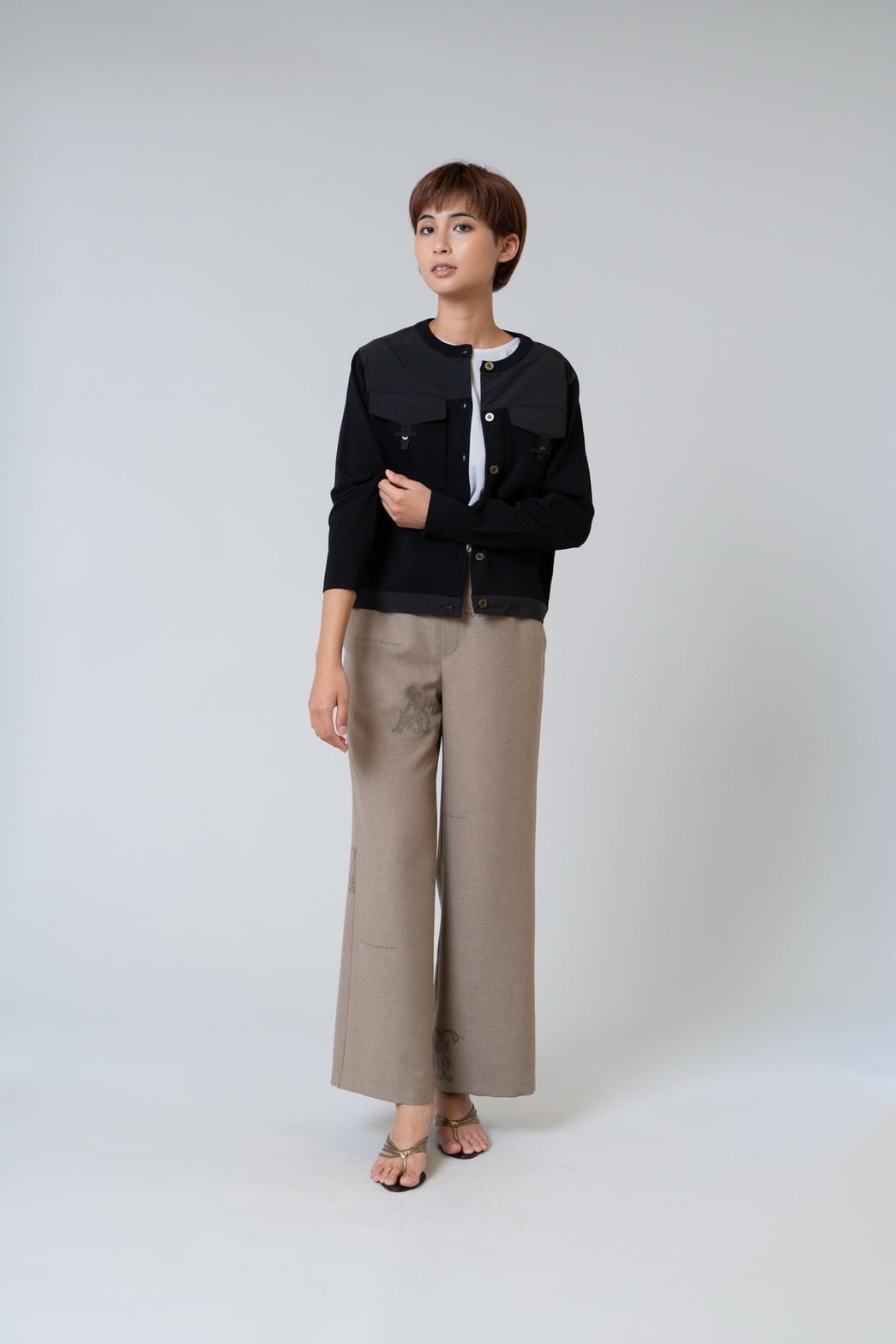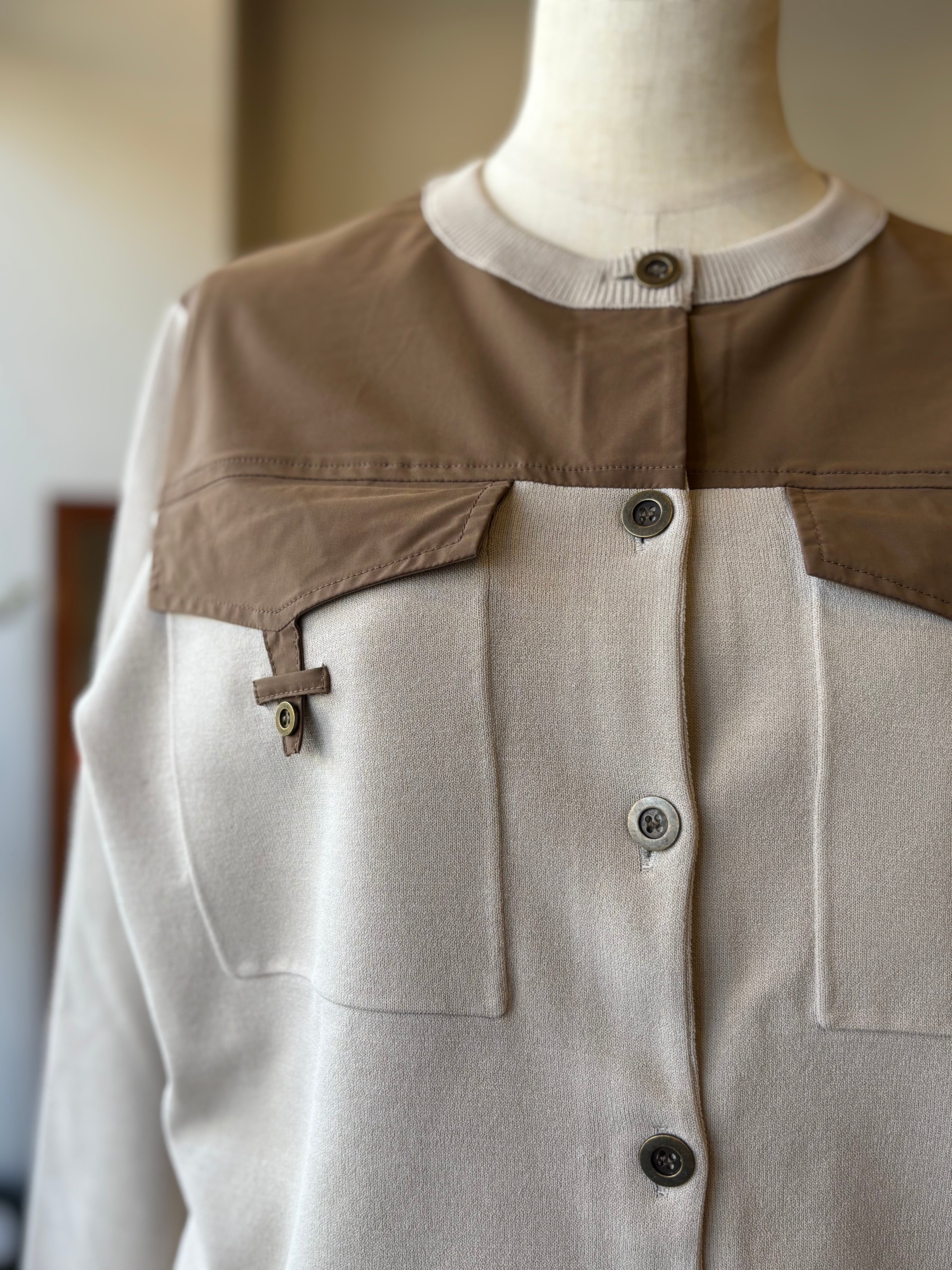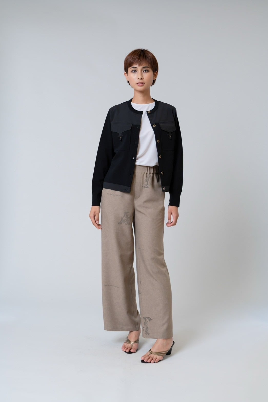 布帛部分が全体を引き締め、羽織るだけでコーディネートに立体感と上品さをプラスします。