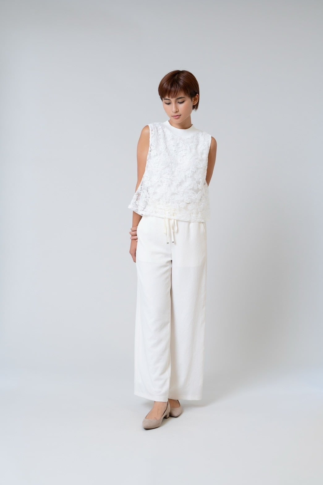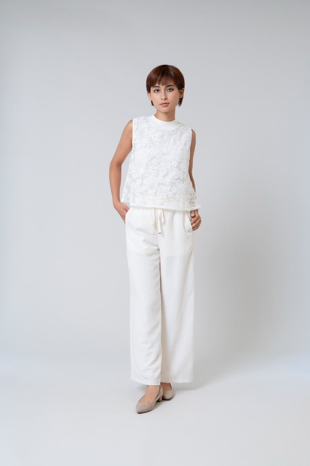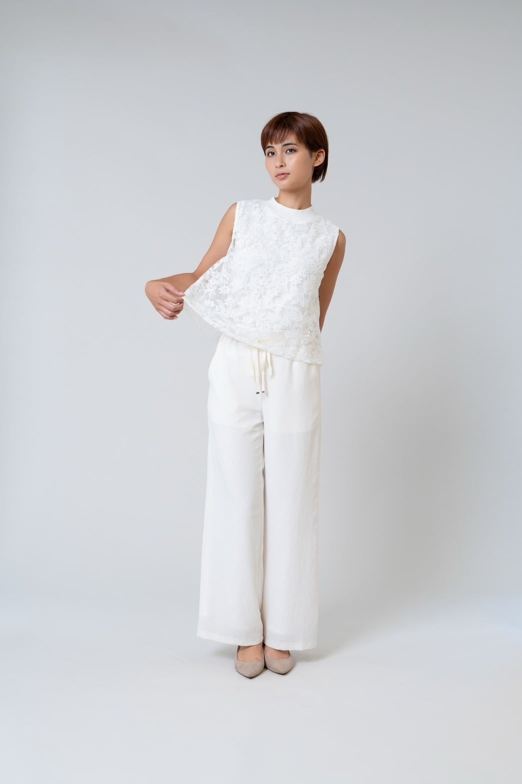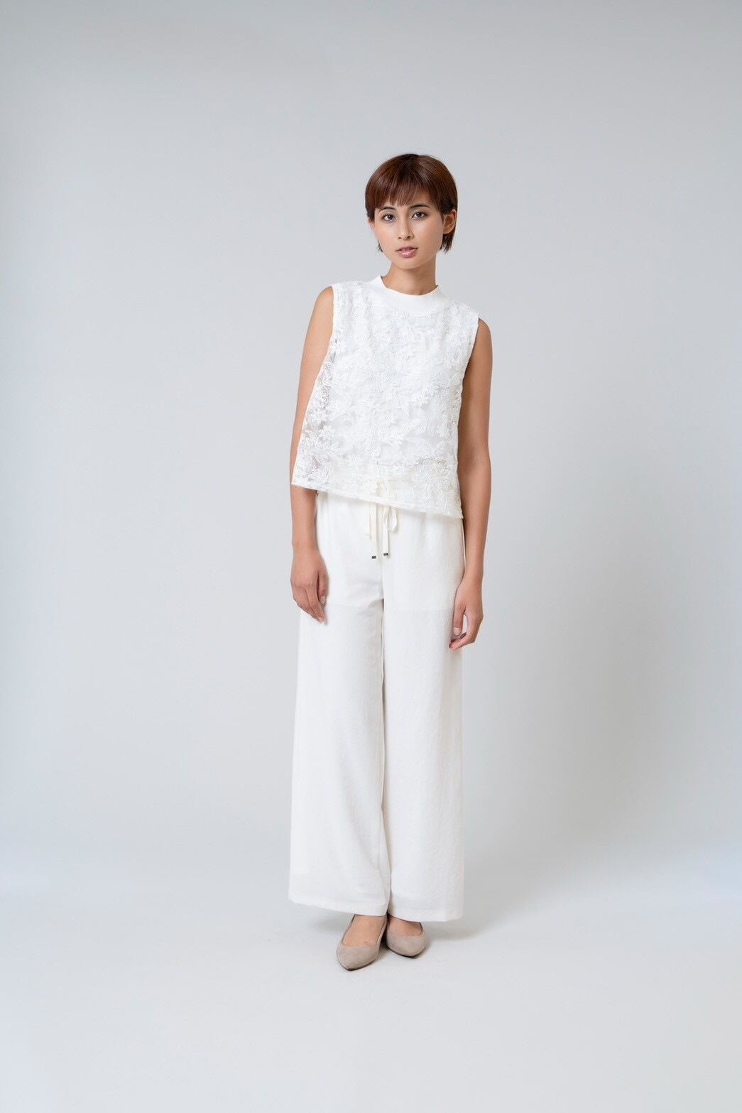 モックネックレースノースリーブ。