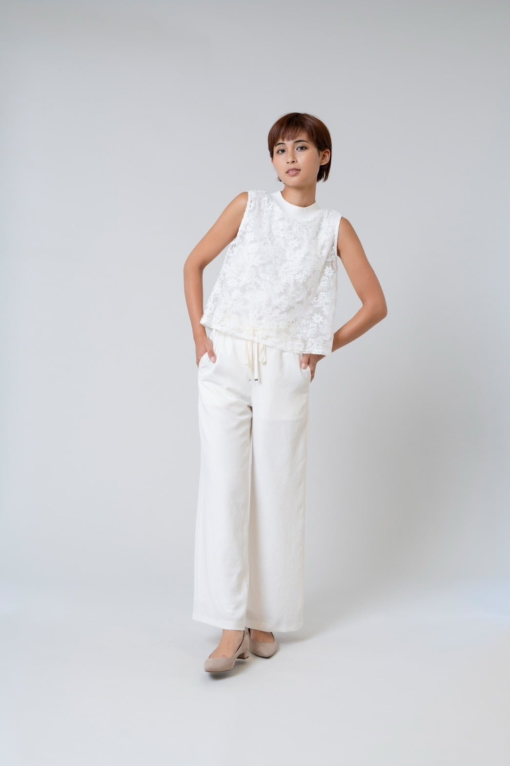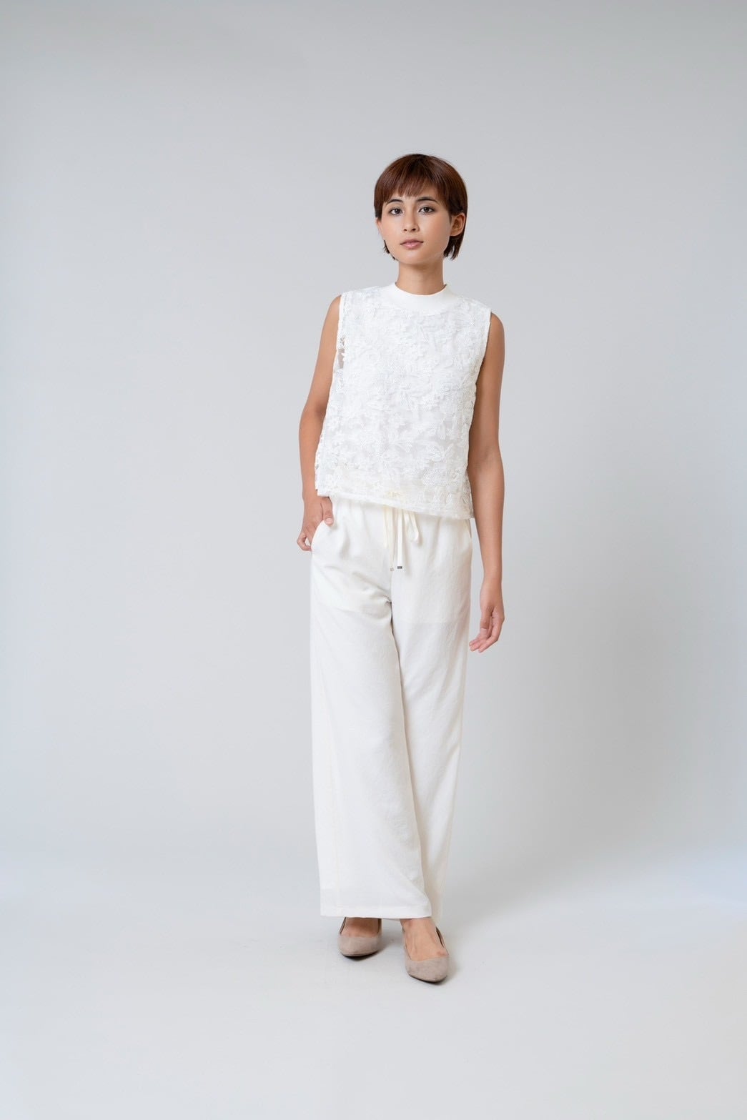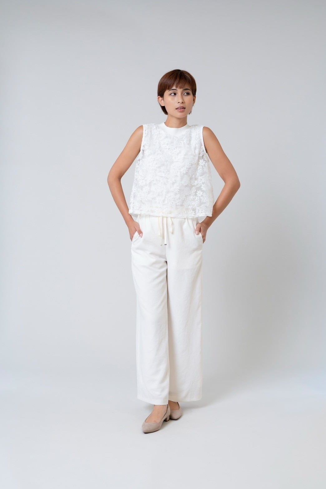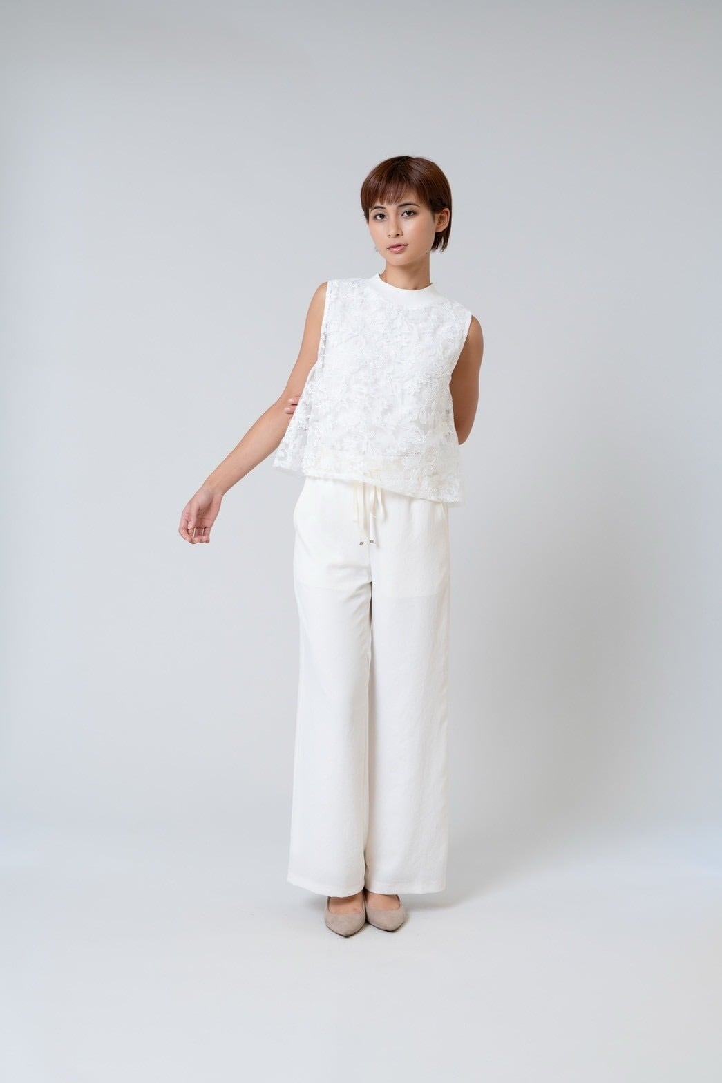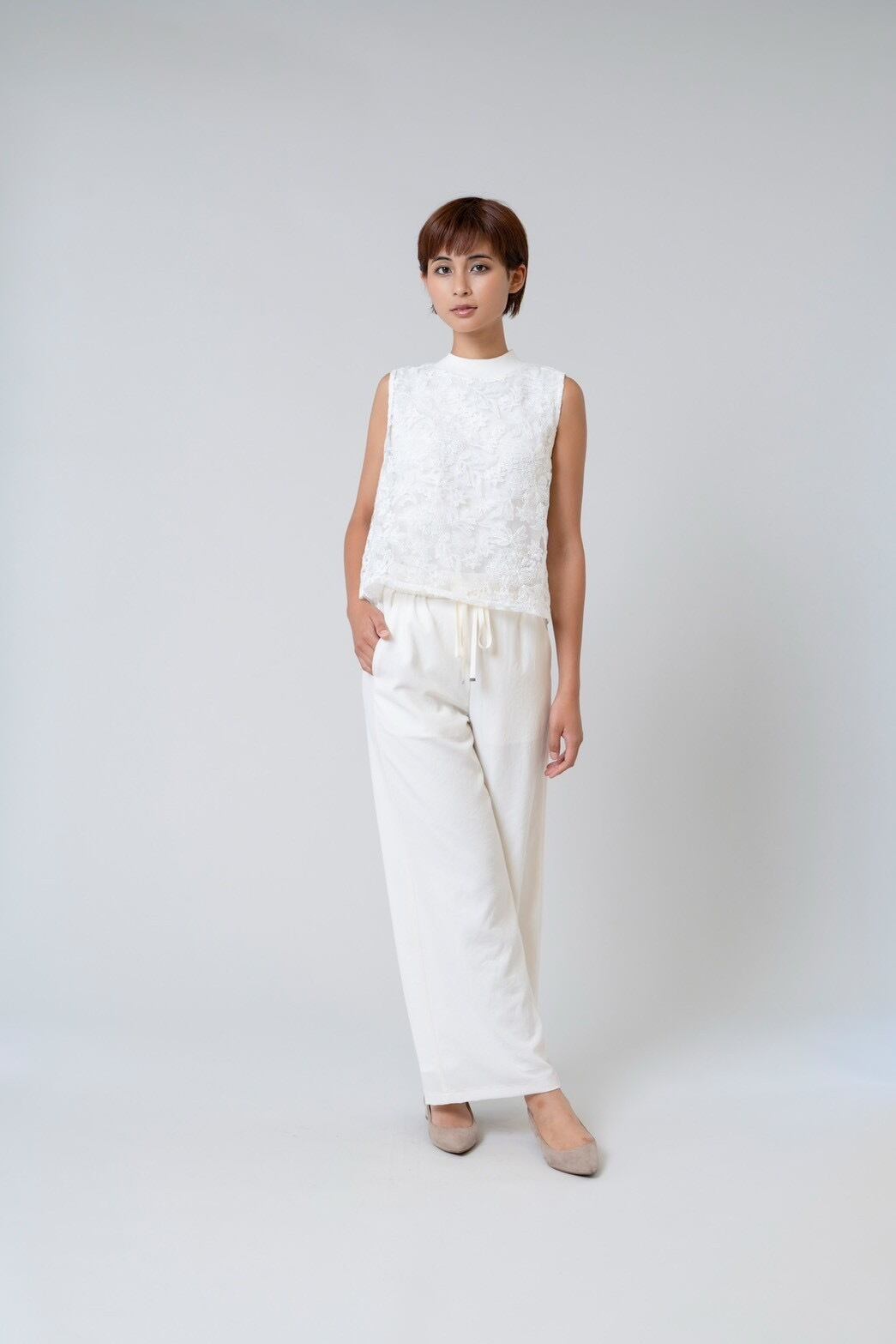 モックネックレースノースリーブ。