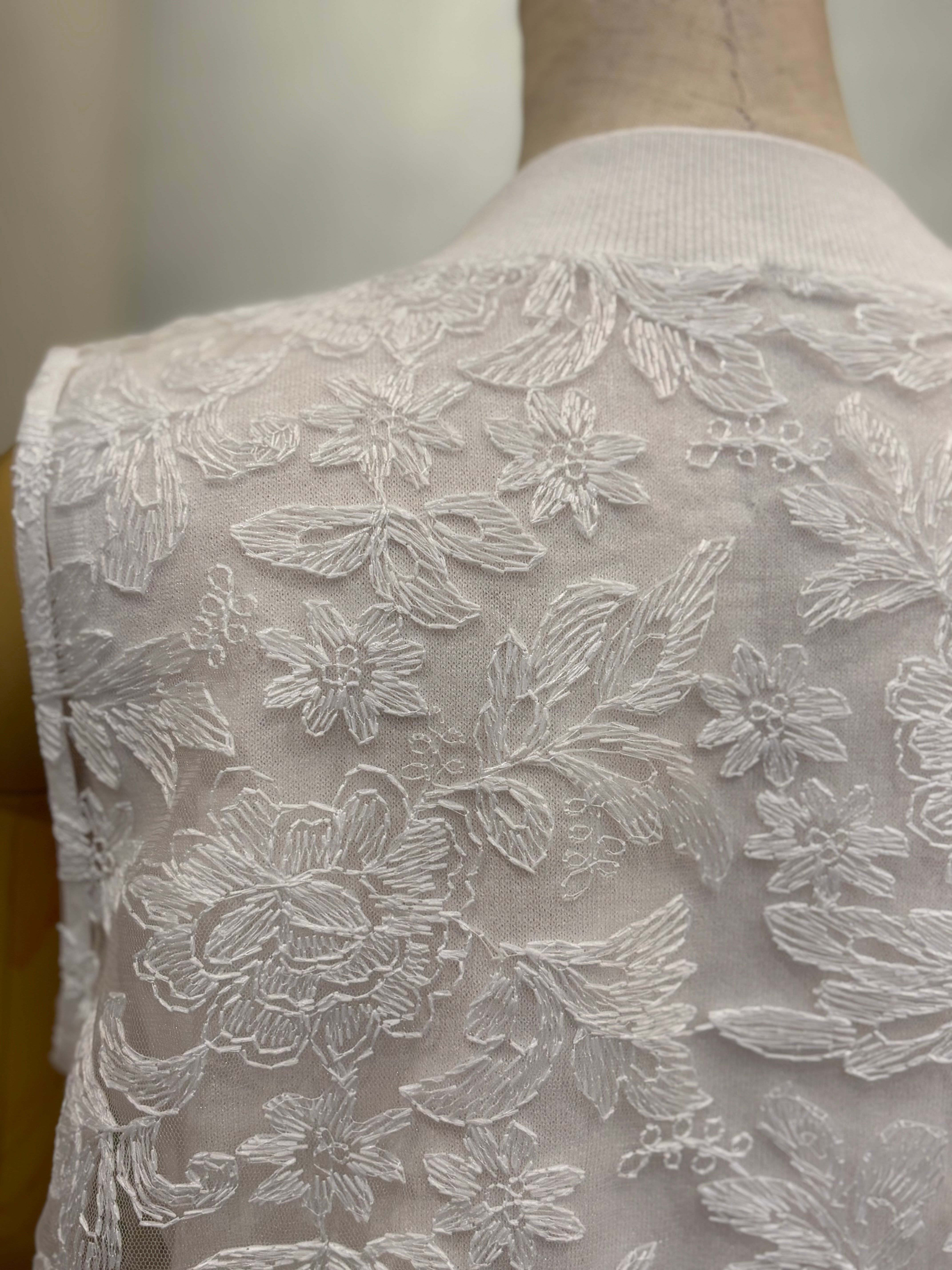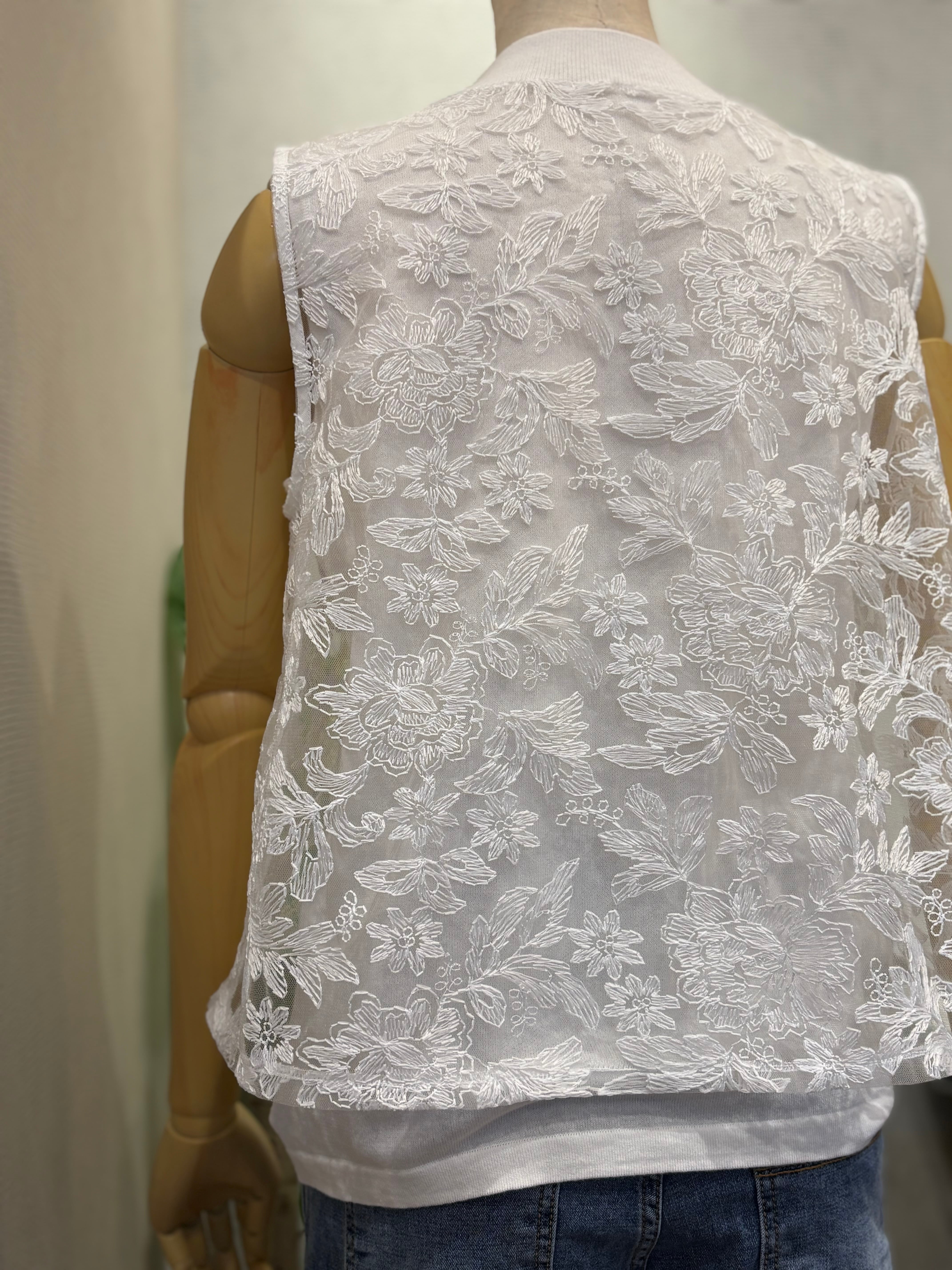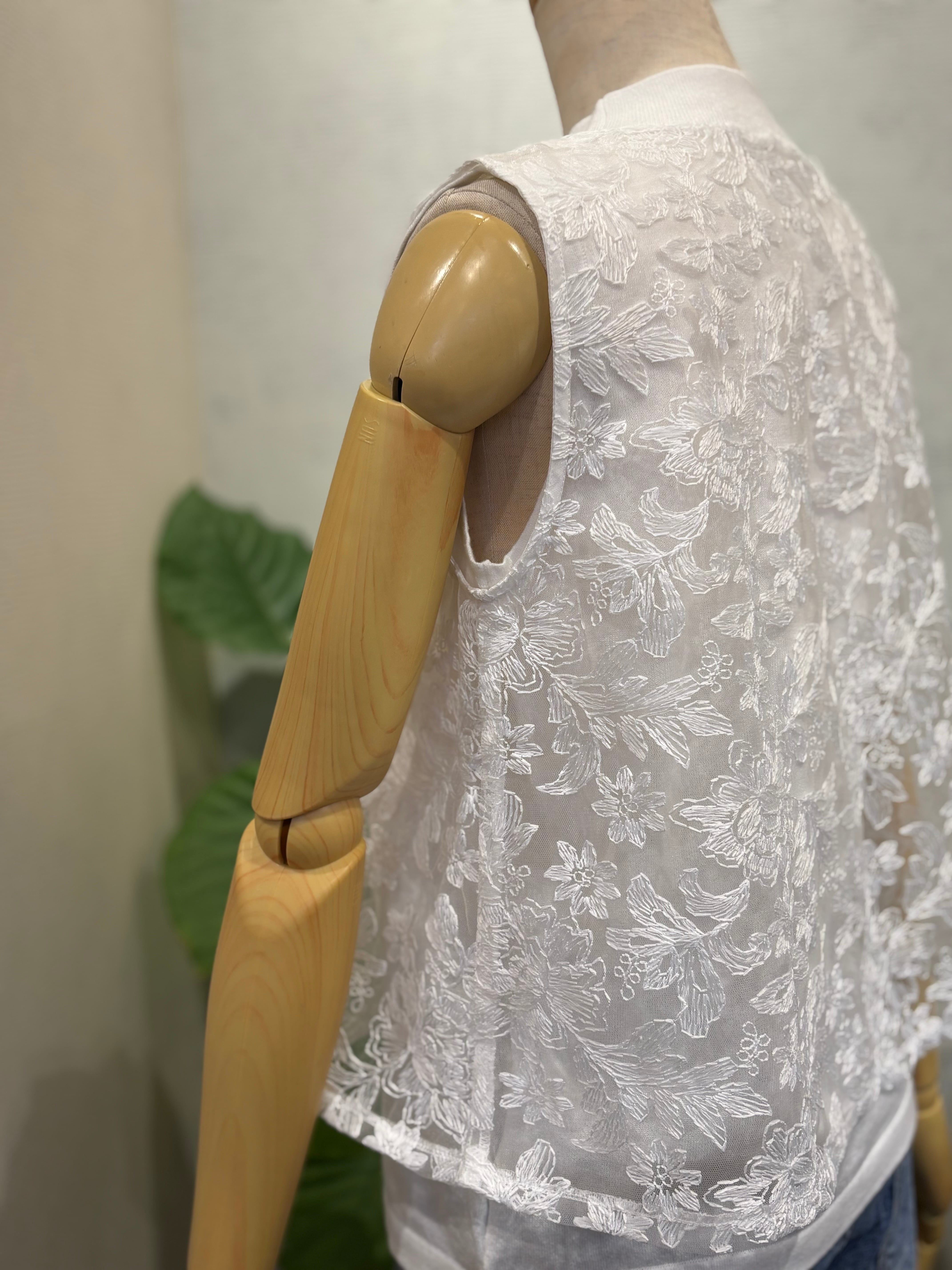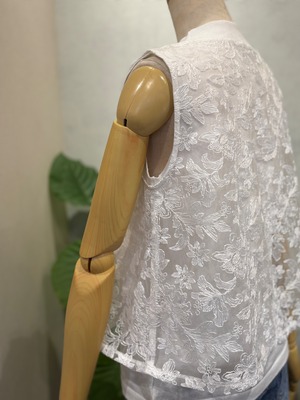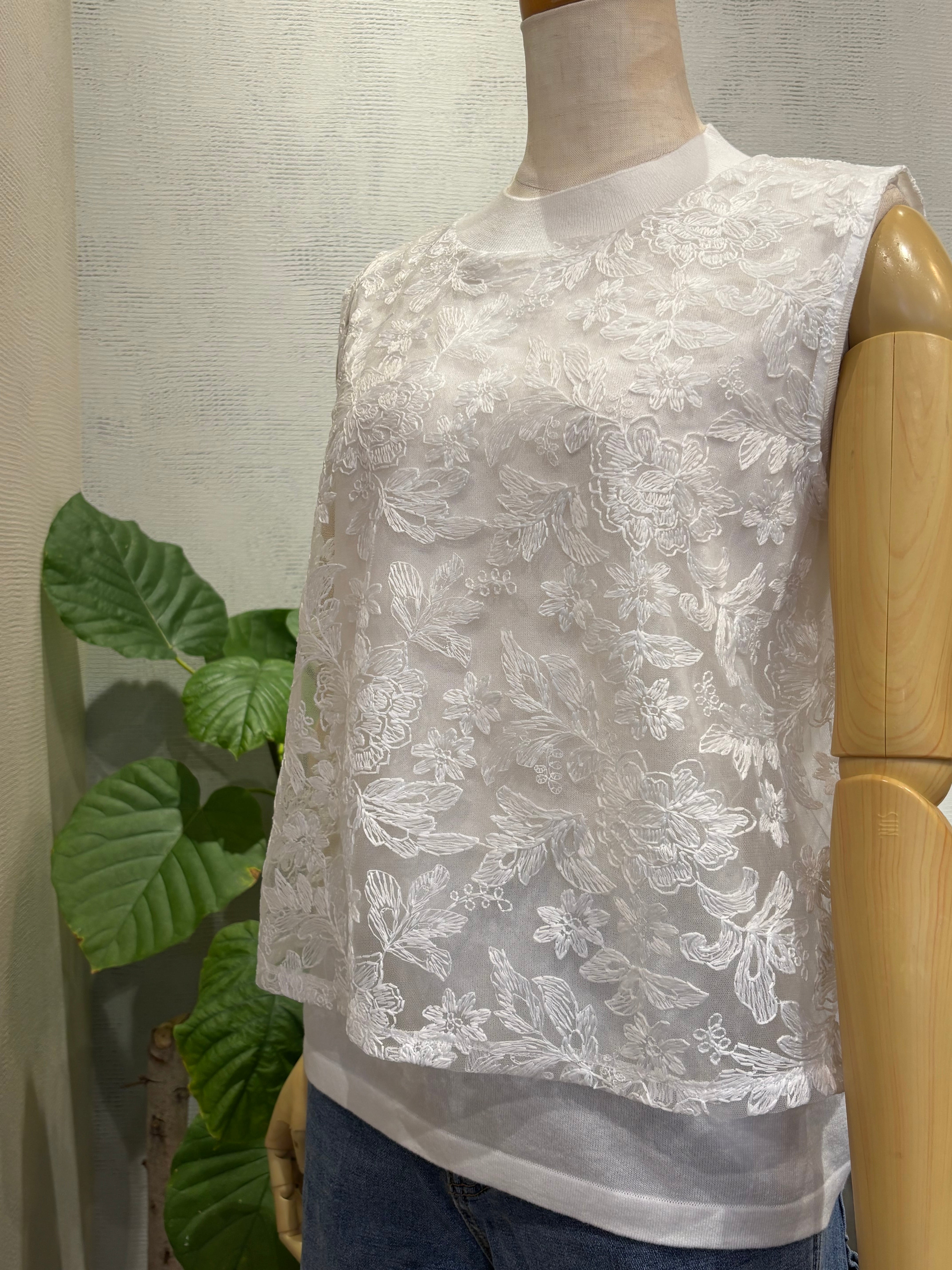 コットン100%のニットのインナーに、 P261-21008レースプルオーバーと同じ素材を重ねた、上品で華やかな雰囲気が魅力のノースリーブプルオーバーです。