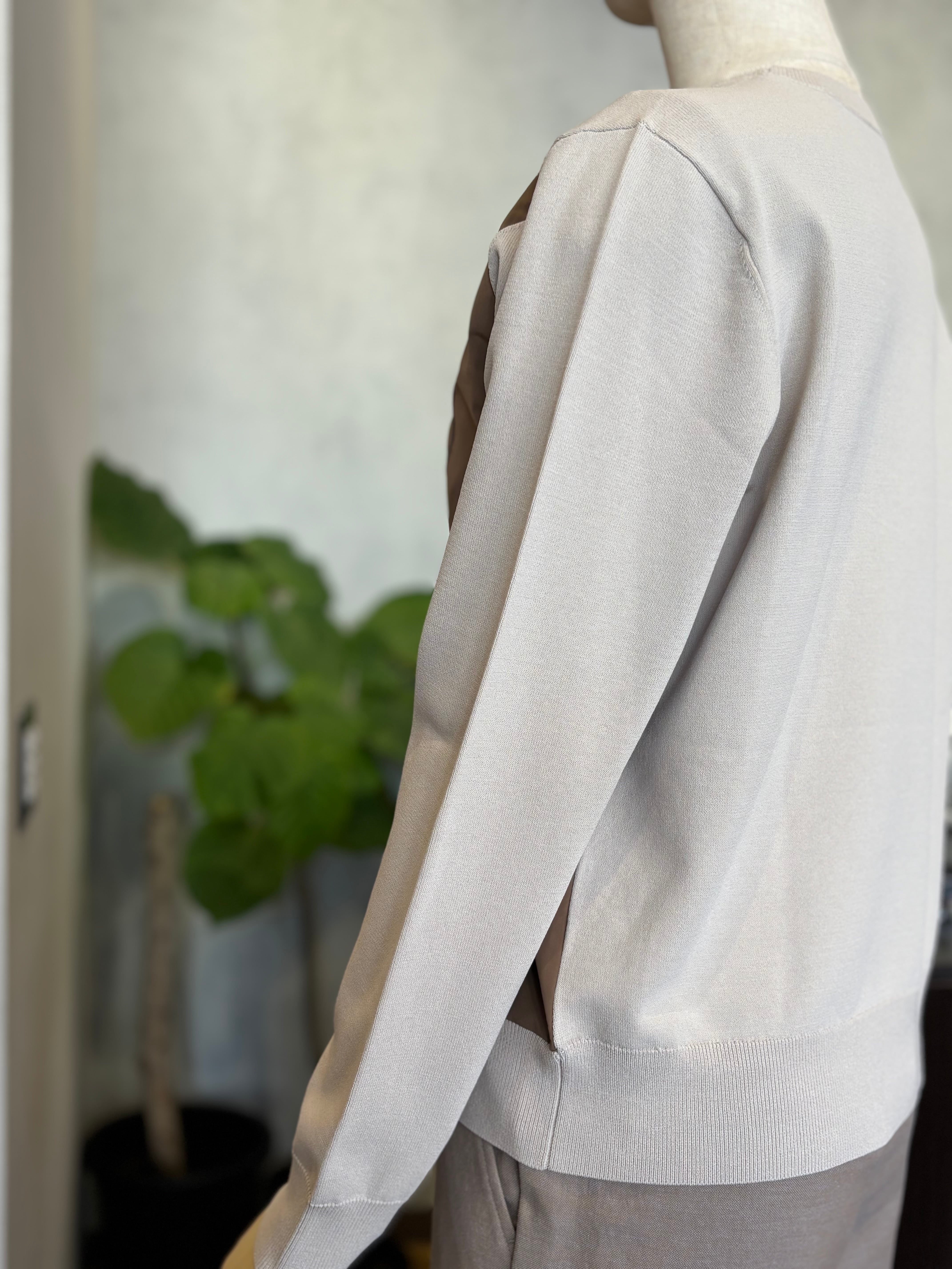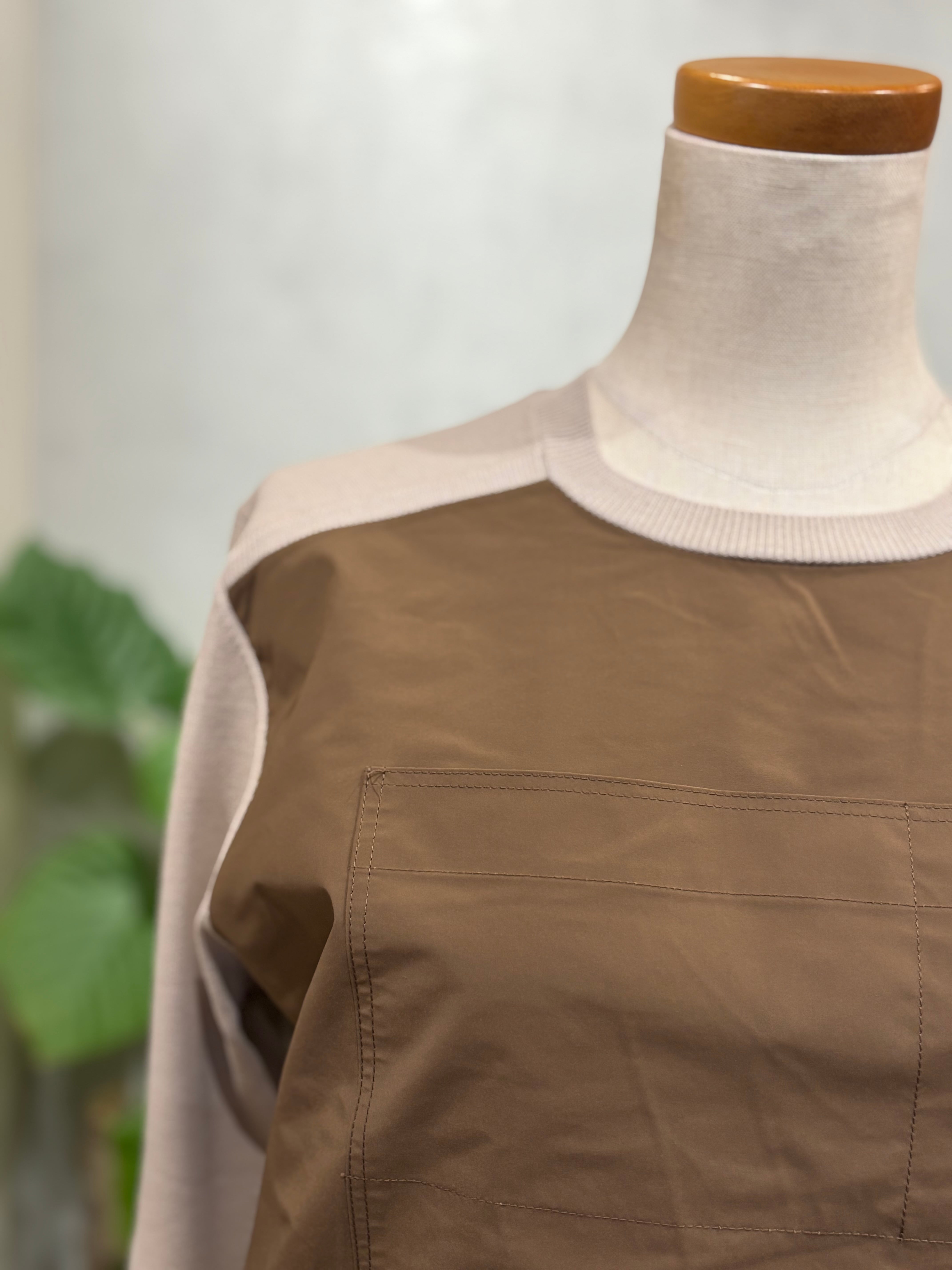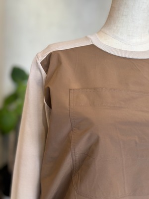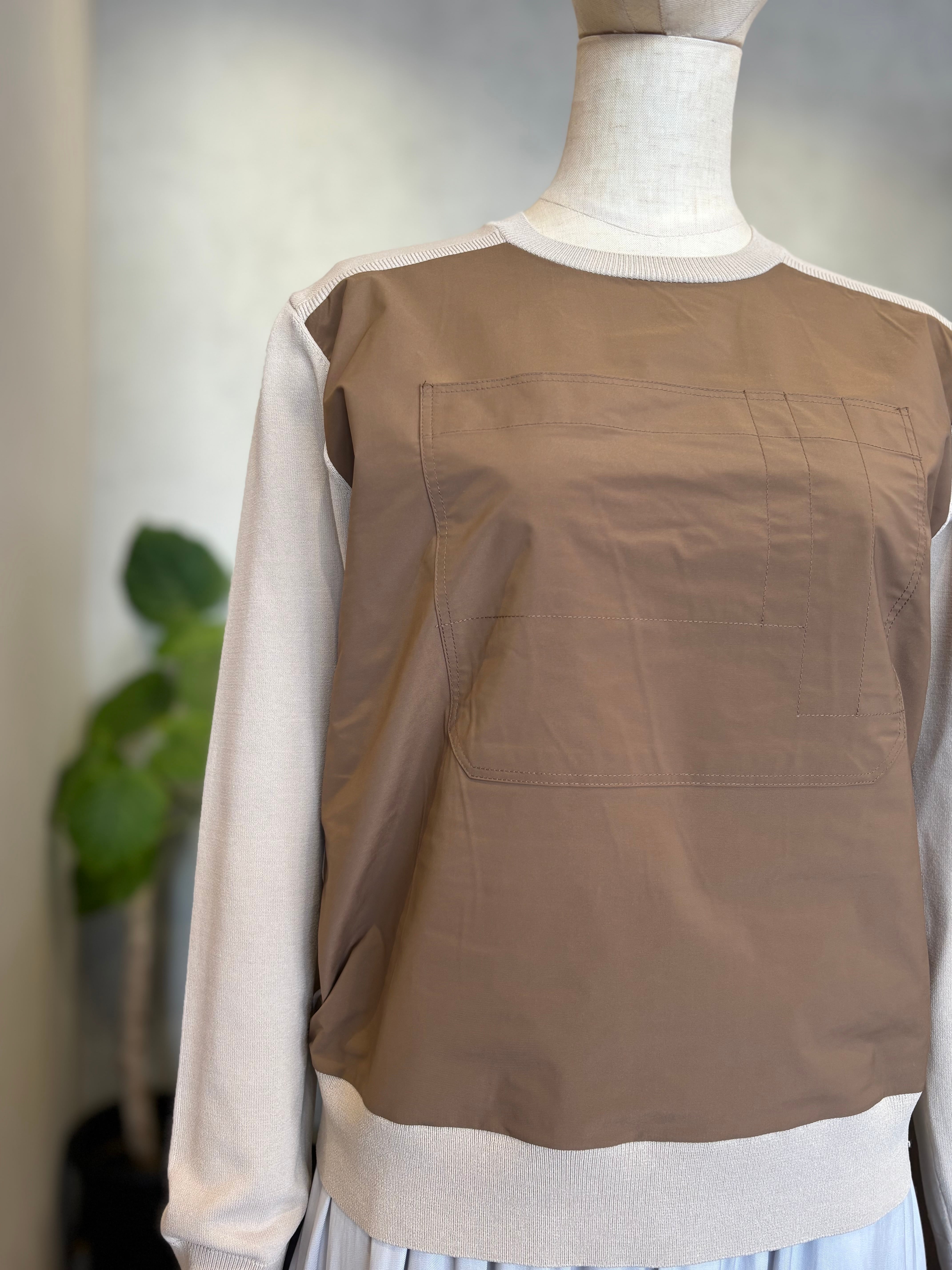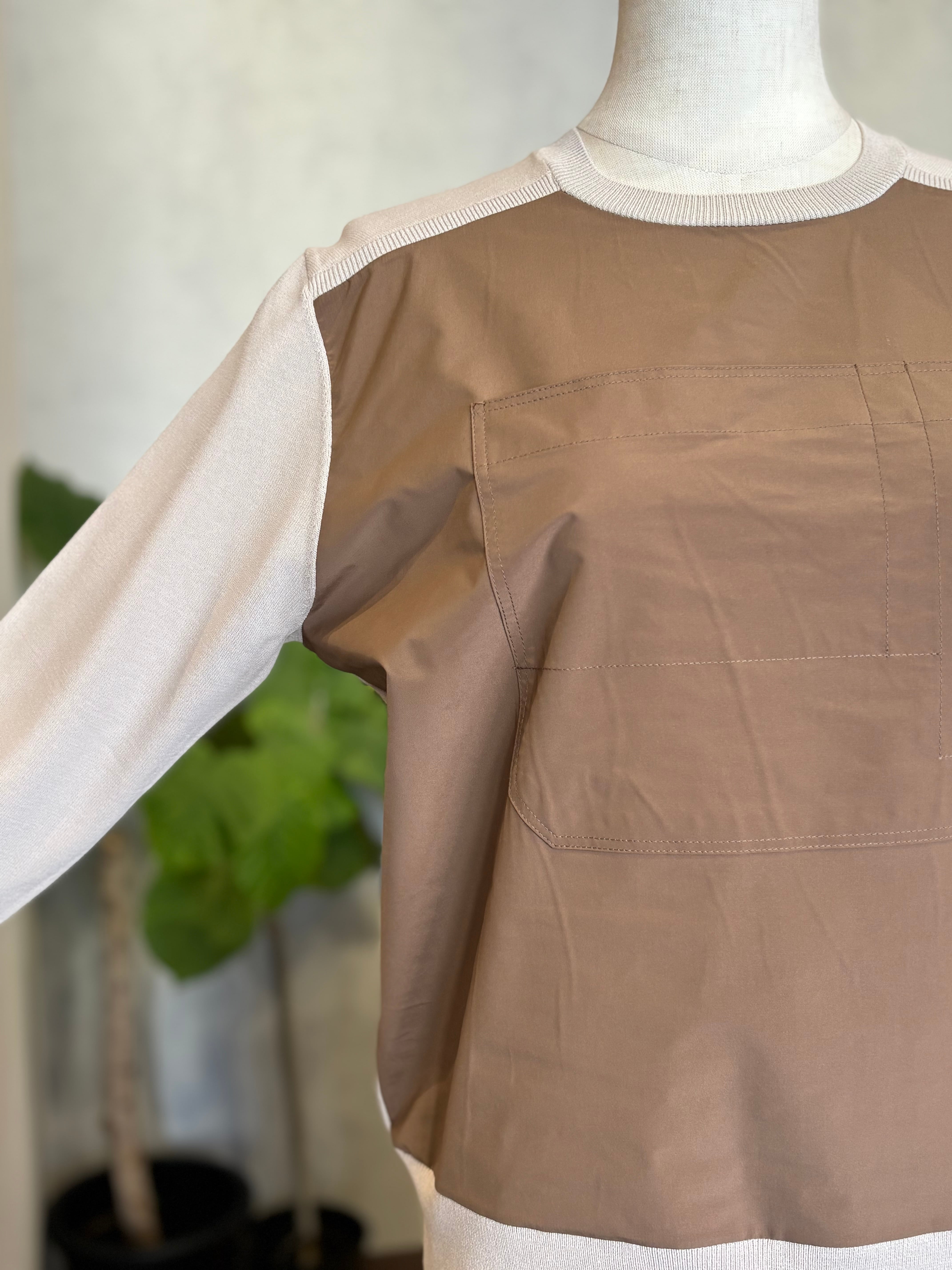 ニットのやわらかな着心地と、前身ごろの光沢感のある布帛がもつきちんと感を 一枚で楽しめるドッキングプルオーバー。