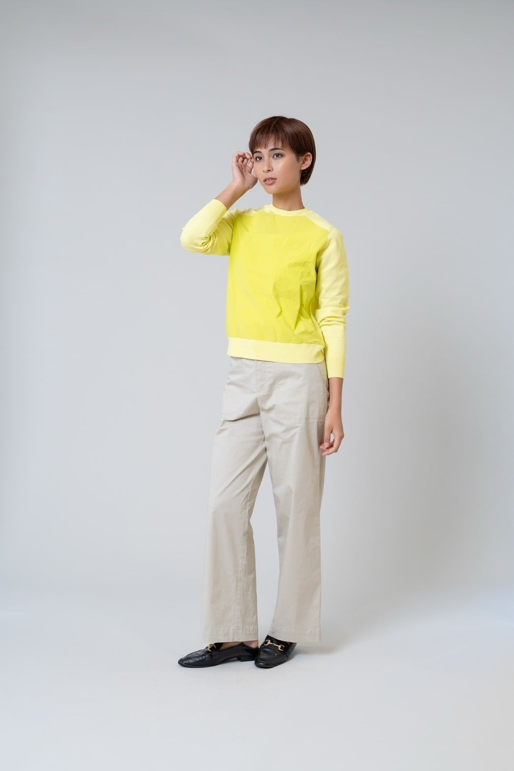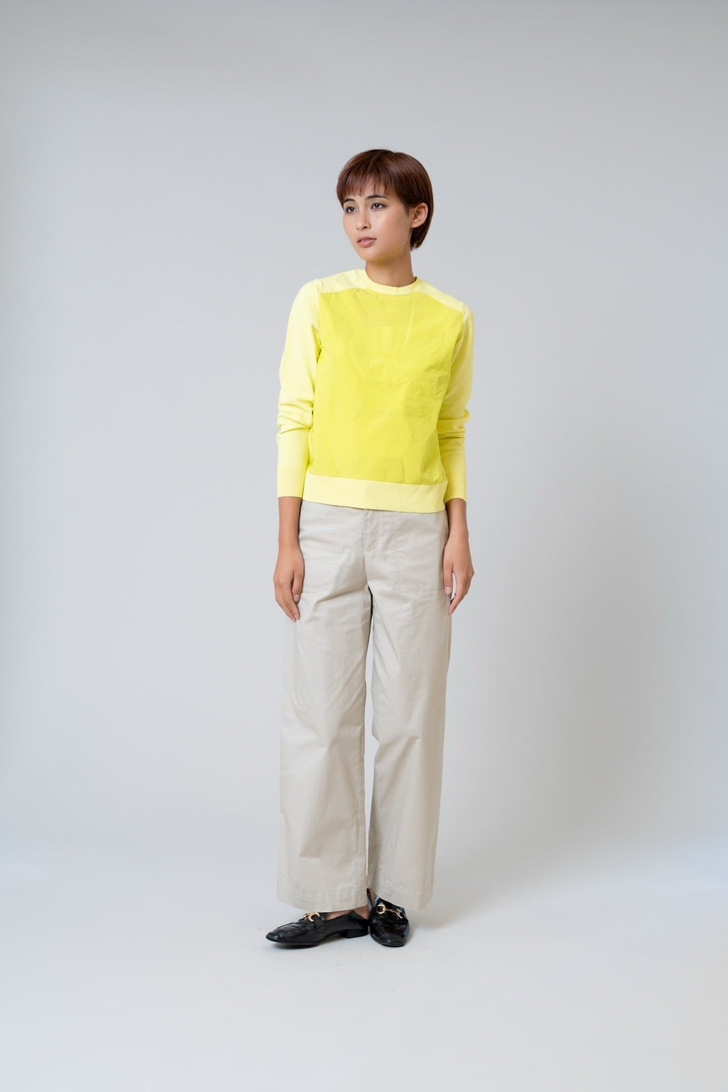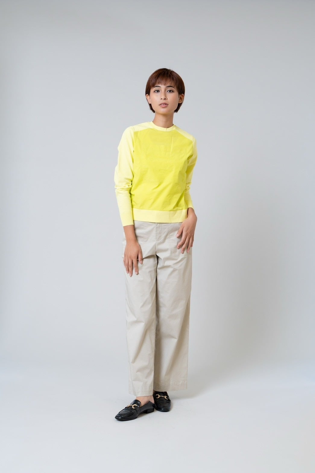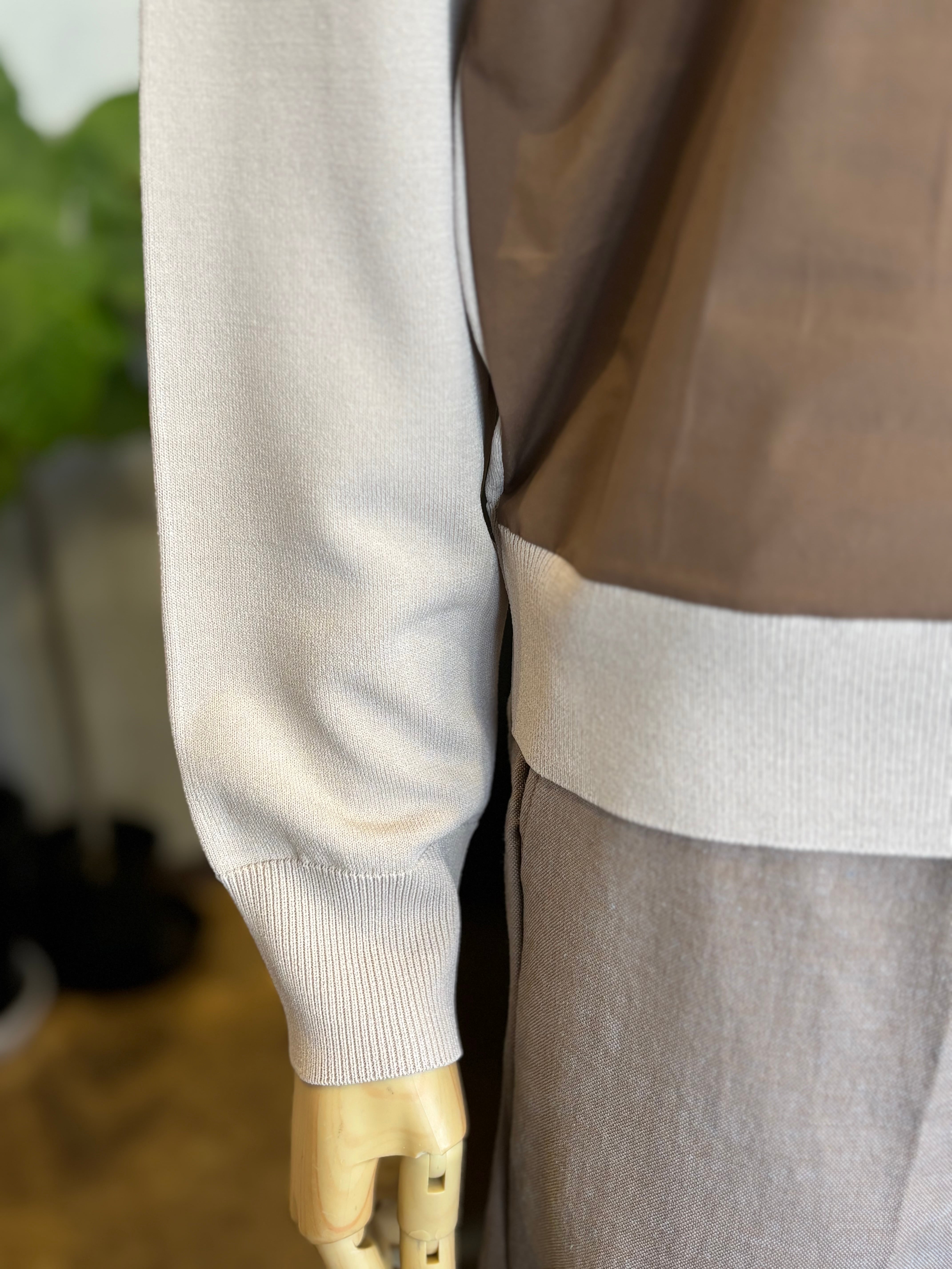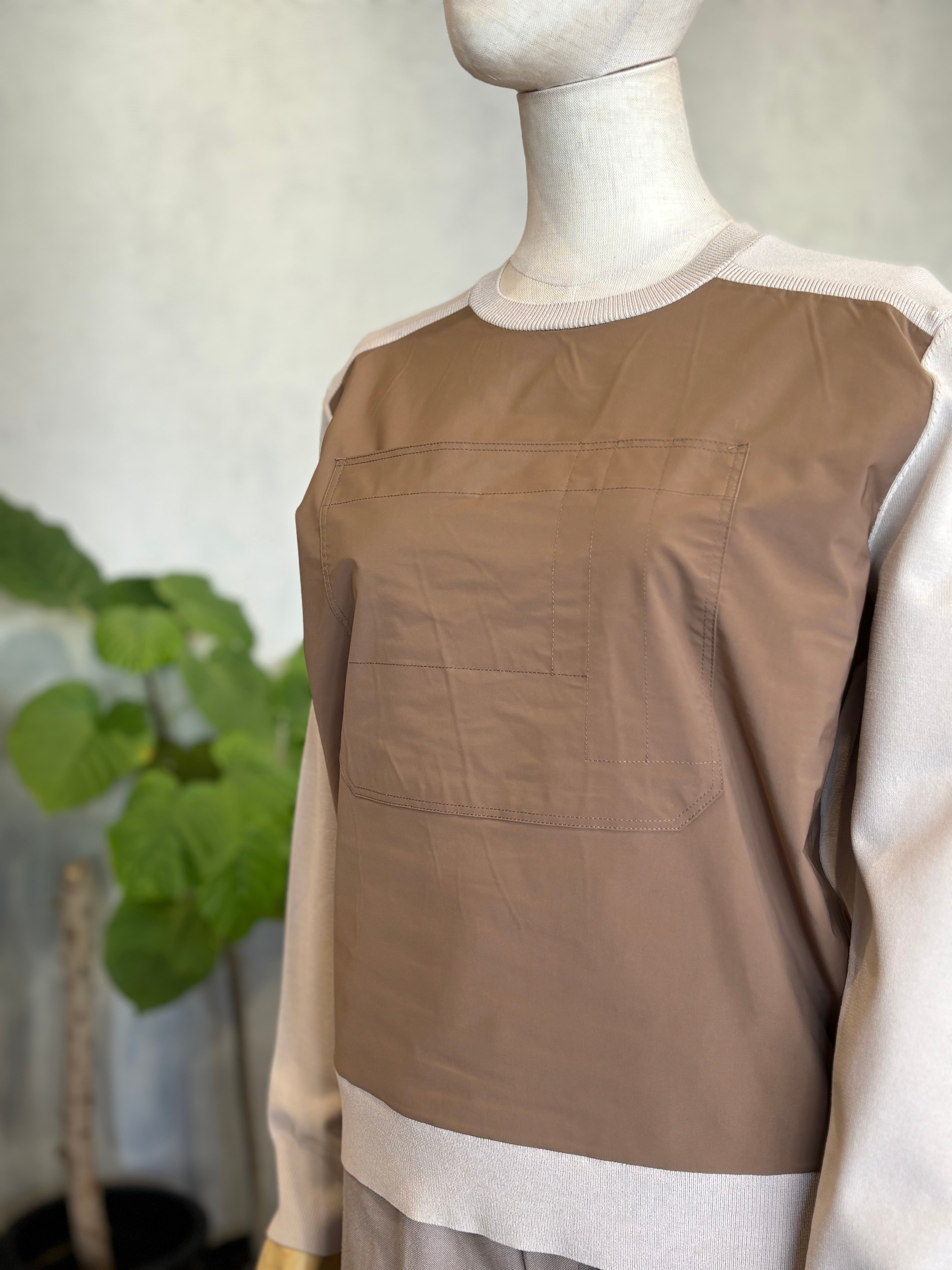 ニットのやわらかな着心地と、前身ごろの光沢感のある布帛がもつきちんと感を 一枚で楽しめるドッキングプルオーバー。