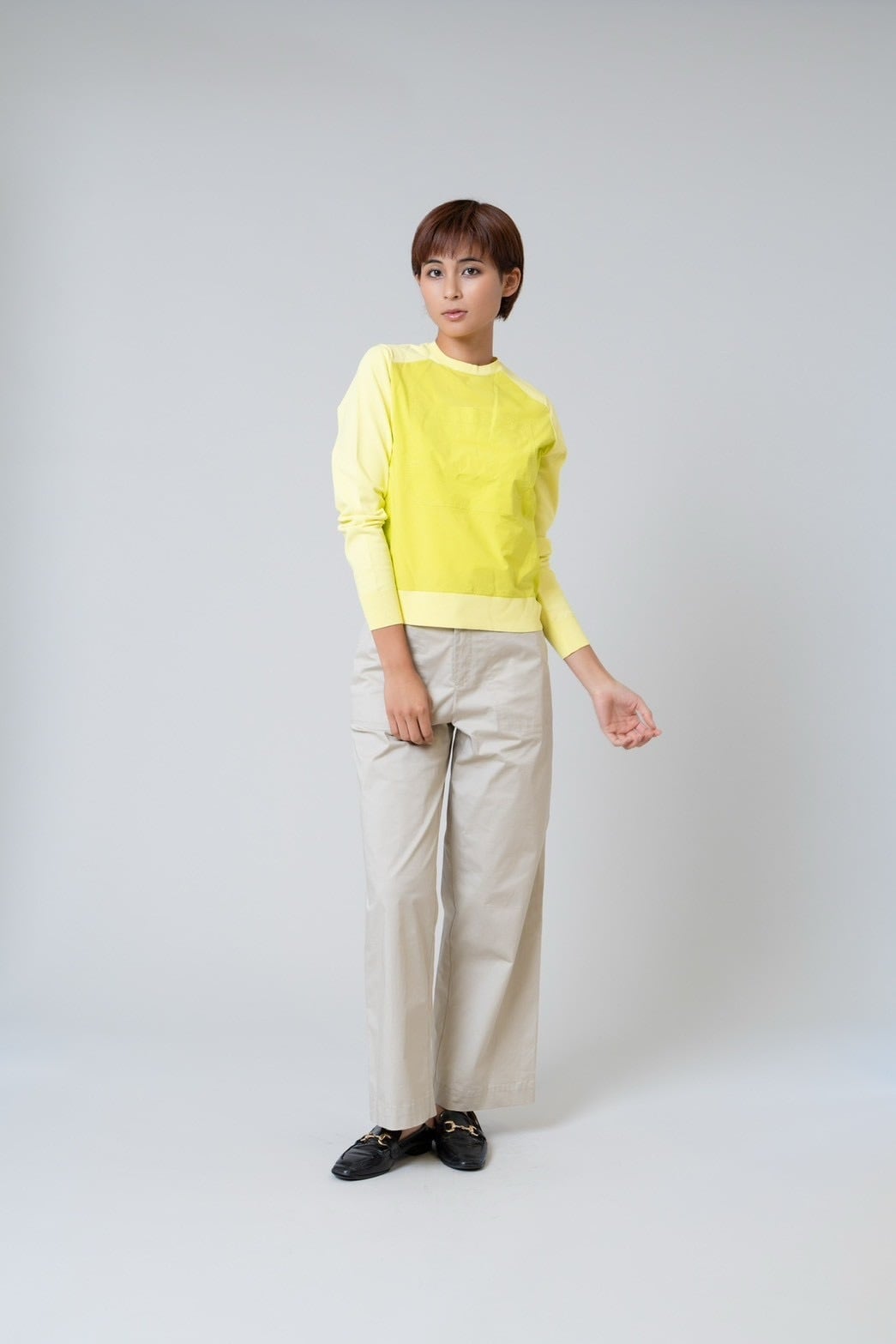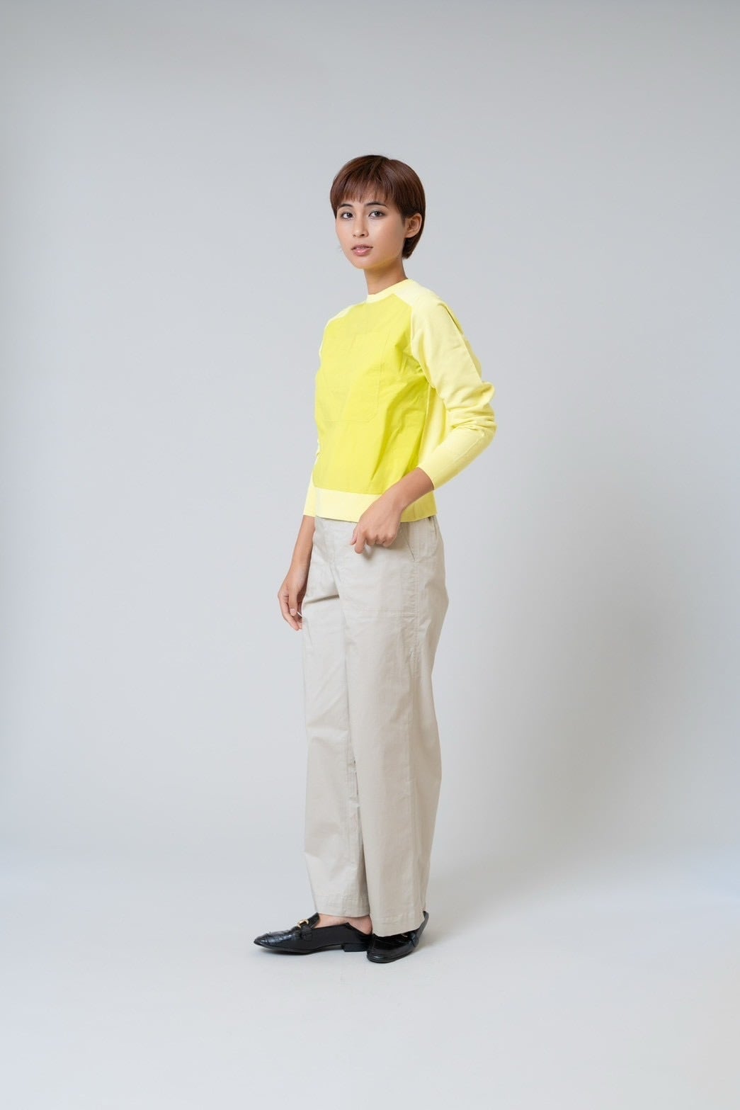 切り替え部分に配したポリエステル布帛が、さりげないアクセントとなり、シンプルながらも洗練された印象を演出します。