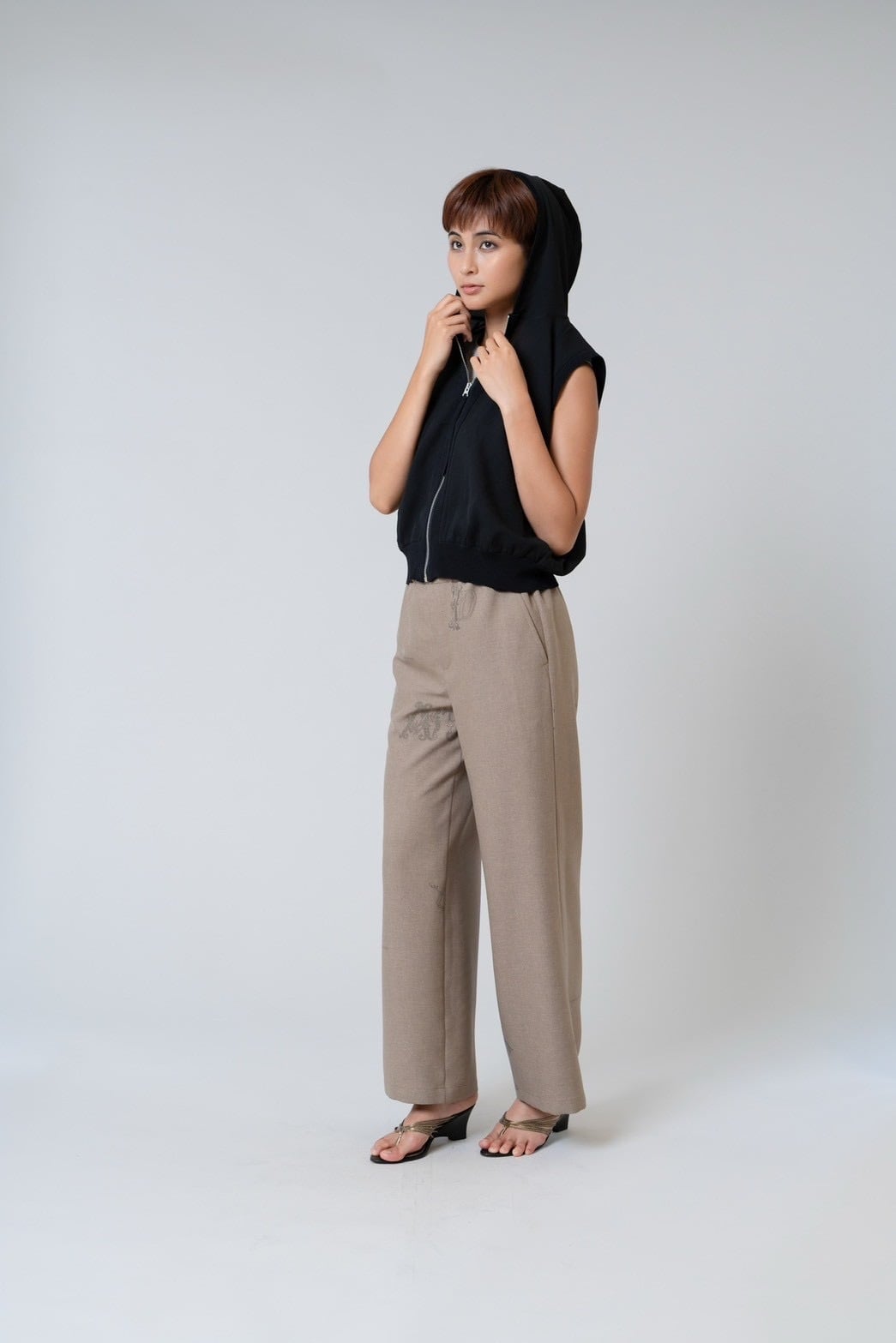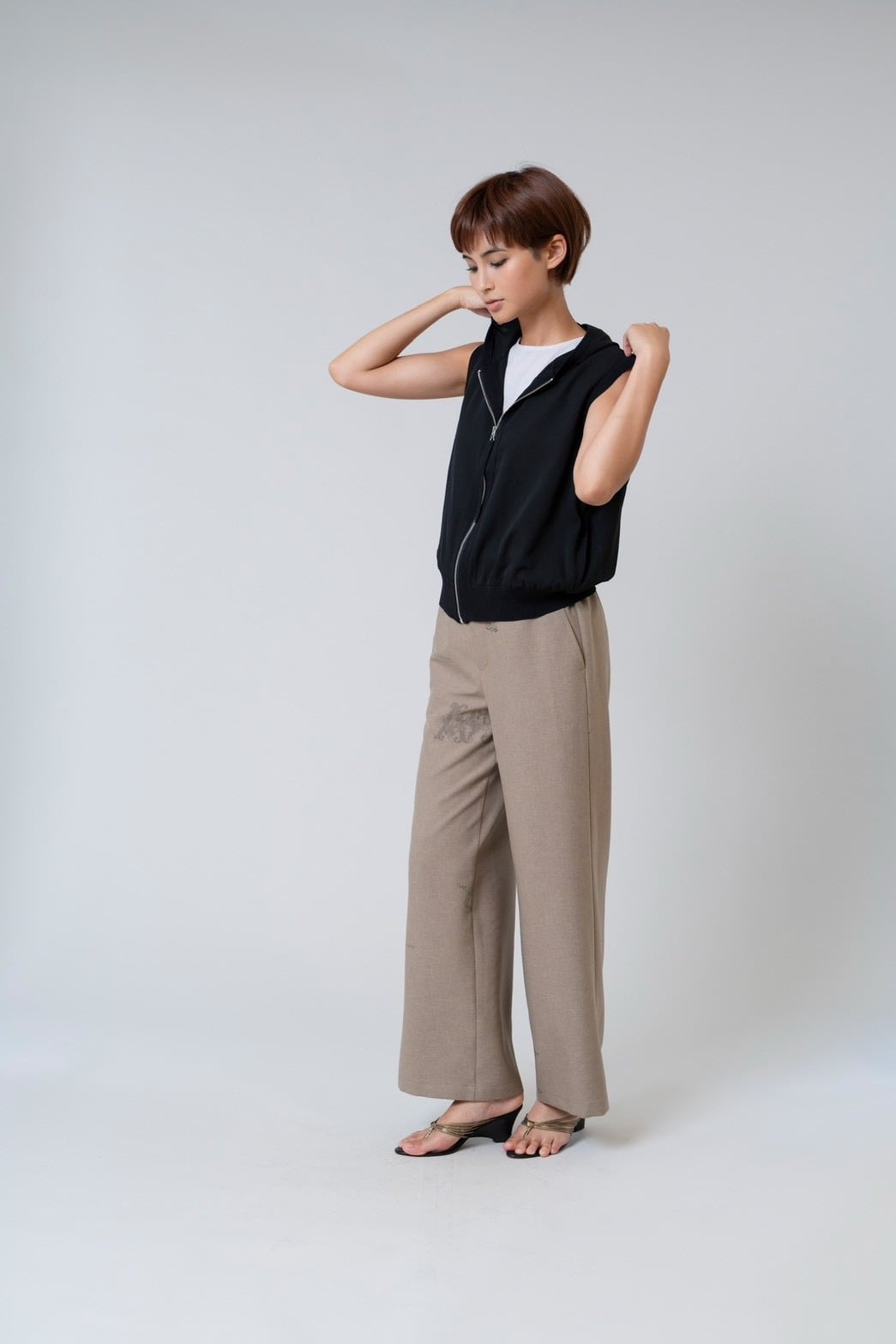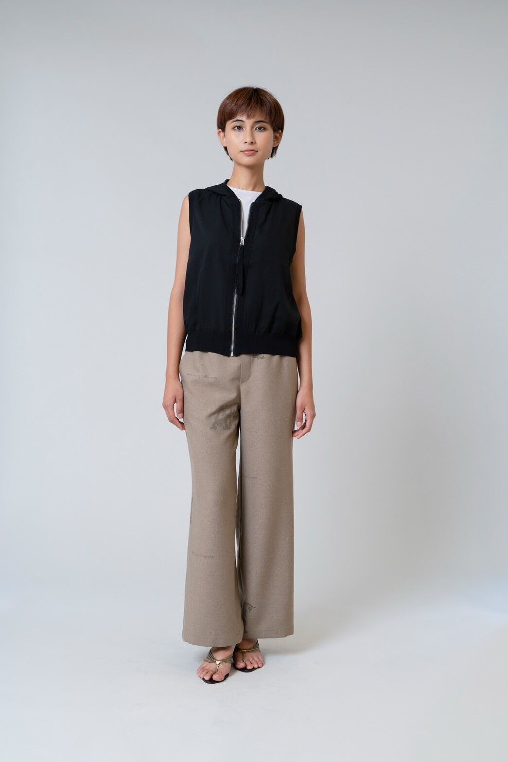 軽やかなシアー素材が印象的なフード付きジップジレ。