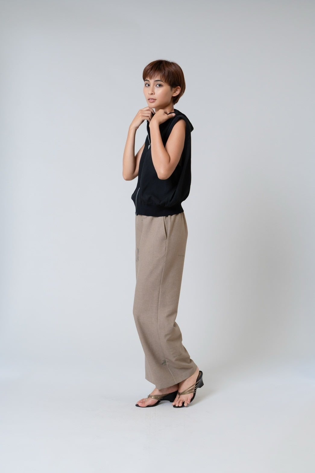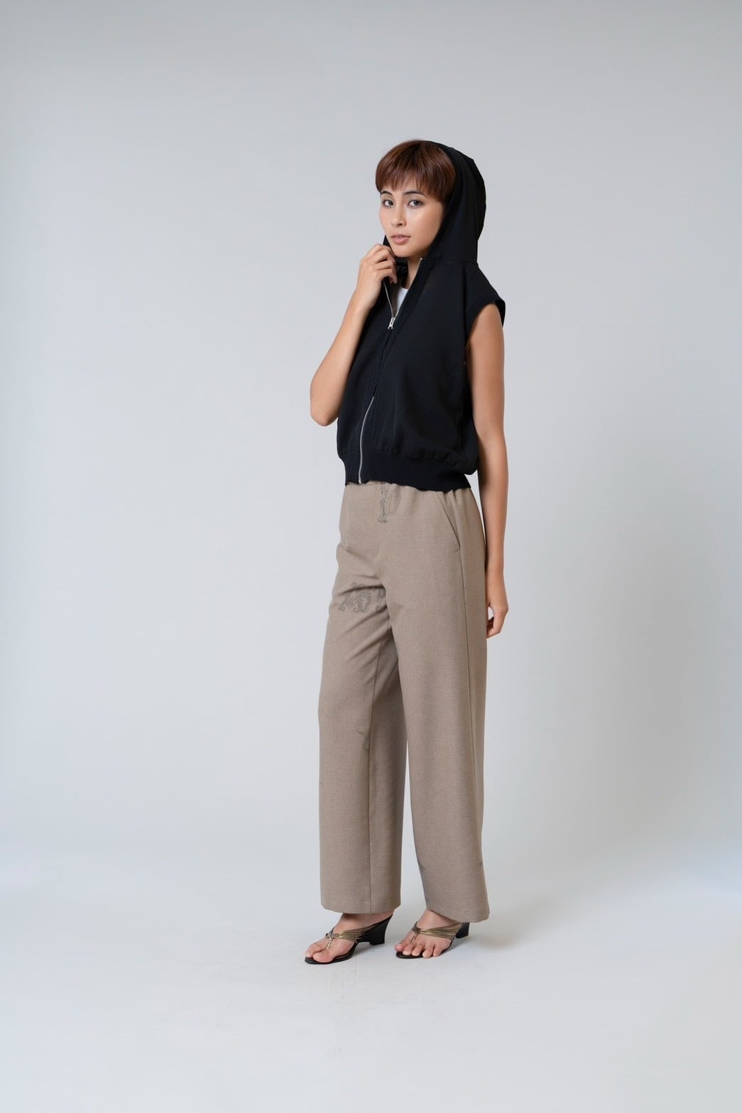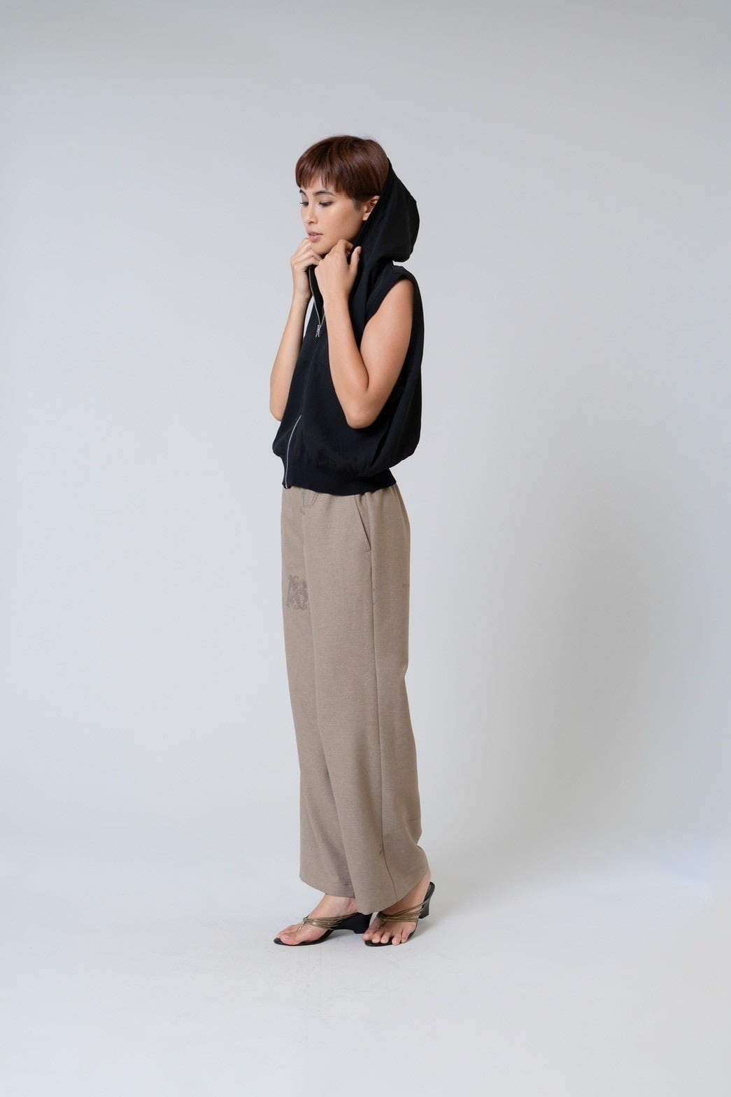 軽やかなシアー素材が印象的なフード付きジップジレ。