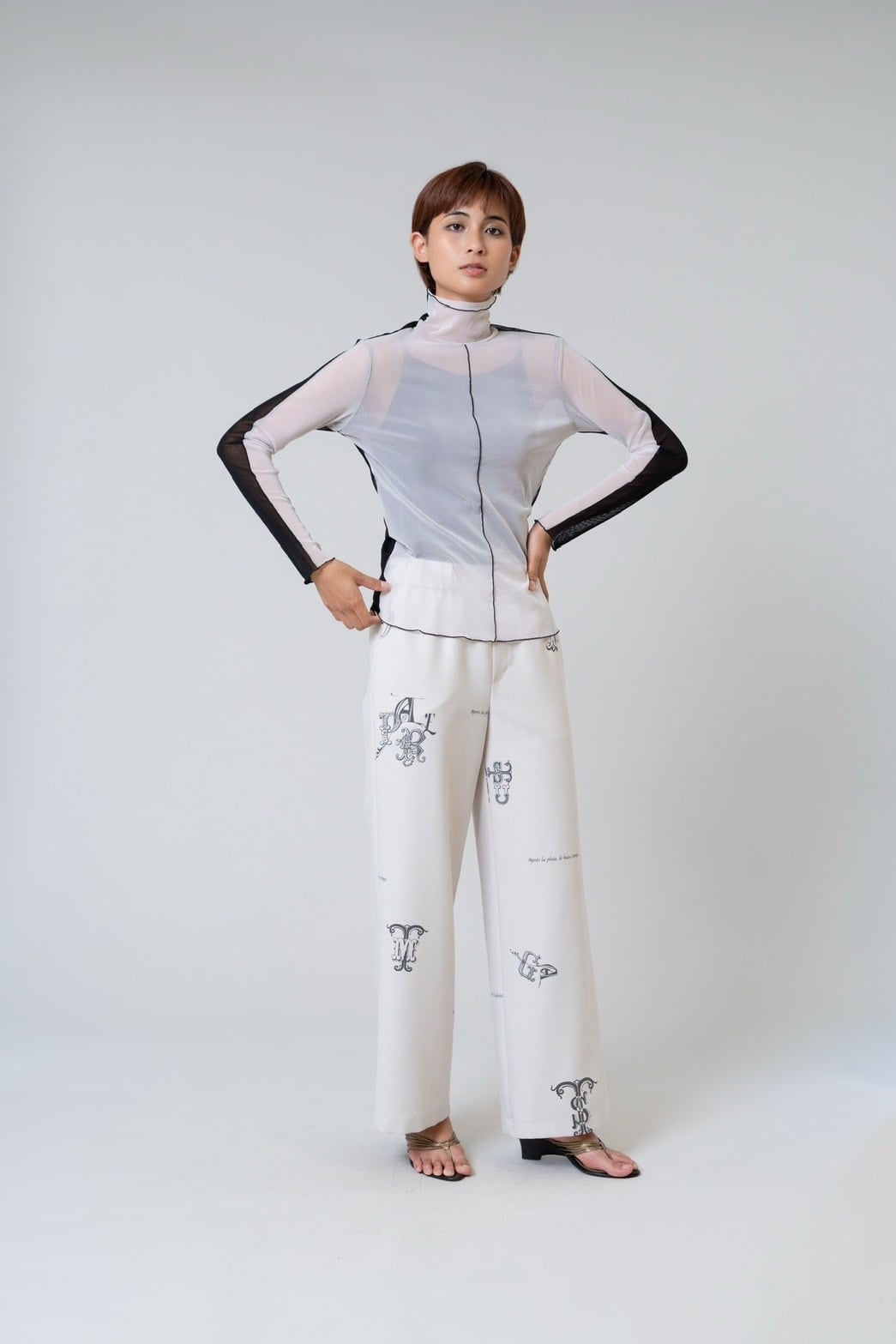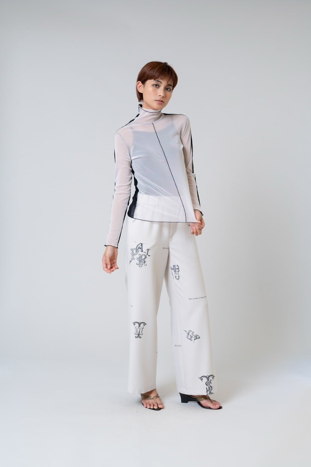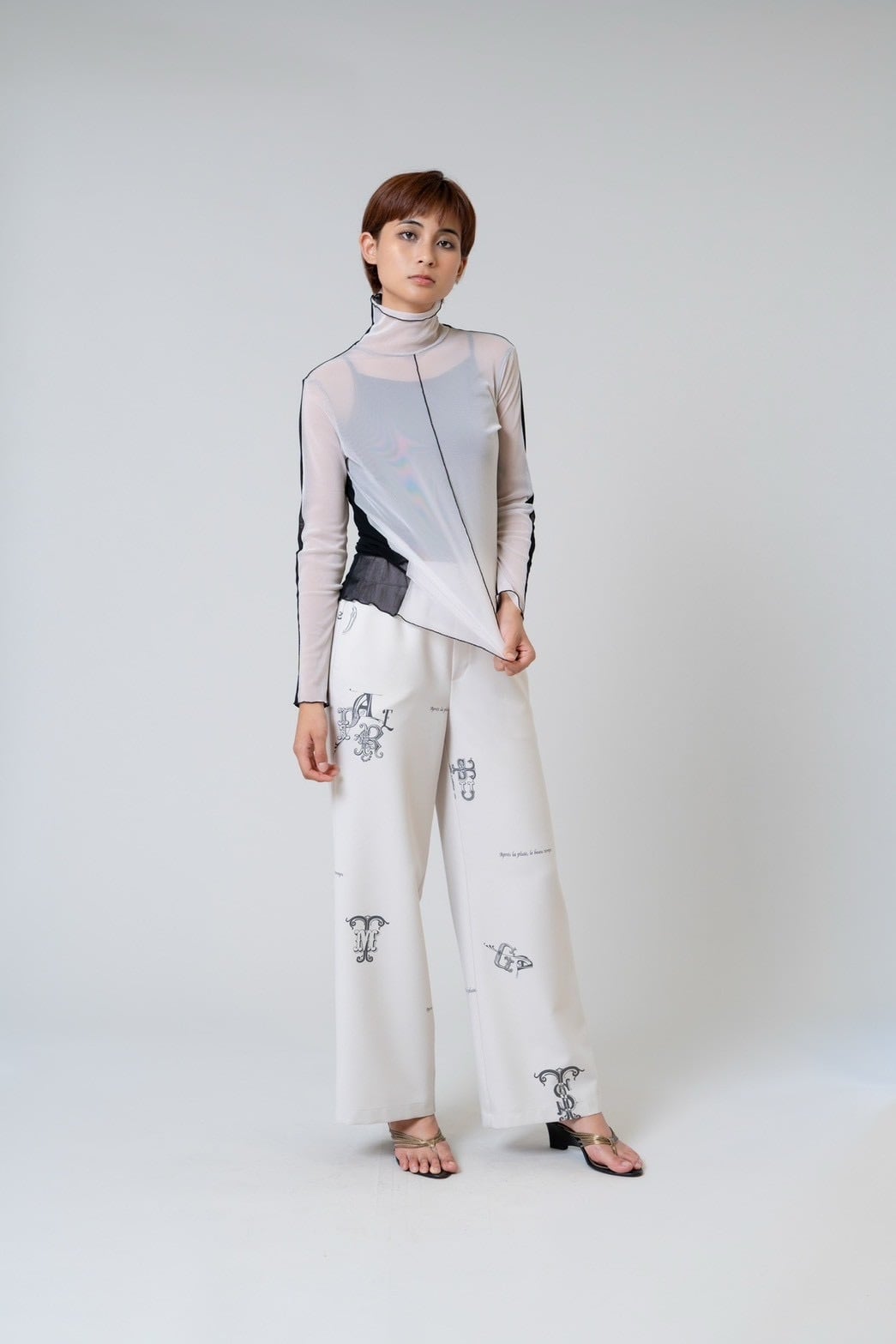 程よい透け感のあるパワーネット素材が、軽やかで女性らしい雰囲気を演出します。